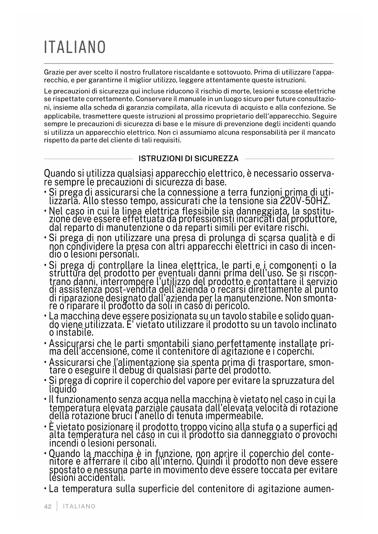 Pulsante Funzione Pulsante di avvio/arresto: Nello stato di standby, scegliere la funzione del menu prima di premere Start/Stop, quindi la macchina inizierà a funzio- nare. Quando la funzione del menu non è selezionata, la pressione del pul- sante Start/Stop non è valida. Nello stato di standby, qualsiasi pulsante tranne Start/Stop non è valido. Dopo aver premuto Start/Stop, la mac- china smetterà di funzionare e tornerà alla modalità pronta. Dopo che il programma è stato eseguito per 1 minuto, tenere premuto per 3 secondi per annullare il programma. Pulsante di riscaldamento: Nello stato di standby, premere questo pulsan- te, il cicalino suonerà, l'indicatore di riscaldamento rimarrà acceso, il tubo digitale visualizzerà il valore di temperatura impostato corrispondente e la manopola può essere ruotata ciclicamente (40° C-100° C) Pulsante Miscela/Pulisci: Per la modalità di pulizia automatica, premere il pulsante Blend/Clean nello stato di standby e premere il pulsante Start/ Stop per avviare. Nello stato di standby, ruotare la manopola, selezionare il menu funzione desiderato e premere Start/Stop per avviare. Il programma viene eseguito automaticamente e, al termine, il cicalino si interrompe dopo sei bip. Pulsante succo di frutta e verdura: Mettere la frutta tritata nel contenito- re di miscelazione, aggiungere la giusta quantità di acqua (non può supe- rare la linea massima della scala di 1750 ml), coprire bene il coperchio del contenitore e ruotare la manopola sulla funzione succo. A questo punto, il pulsante si illumina, premi Start, il programma juice viene eseguito au- tomaticamente. Prima aspirare per 20 secondi, quindi mescolare e inne aspirare per altri 40 secondi. Fallo per circa 3 minuti e ti godrai un deli- zioso succo. Pulsante frappè e frullato: Versare 500 ml di latte e 20 ml di miele. Ag- giungere circa 250 g di frutta surgelata (tagliata prima in pezzi da 20 mm) e selezionare la funzione Milkshake. Il pulsante si illumina. Premere Start, il programma viene eseguito automaticamente. Innanzitutto, pompare il vuoto per 20 secondi, mescolare e inne aspirare per altri 40 secondi. Dopo circa 3 minuti il frappè è nito. Pulsante granita: Mettere una quantità adeguata di cubetti di ghiaccio (circa 250 g) nella vaschetta del ghiaccio del frigorifero, metterla nel contenitore per mescolare, coprire il contenitore con il coperchio e serrar- lo, quindi selezionare la funzione granita. Il pulsante si illumina, premere Start e il programma granita si avvia automaticamente. 1 minuto e 20 se- condi circa dopo, la tua granita è nita. Pulsante purè di patate: Mettere nel boccale le patate lessate e sbuccia- te (non più di 400 grammi), aggiungere circa 250 ml di acqua o latte e 50 g di burro o 50 ml di olio. Coprire bene il coperchio del contenitore e selezionare la funzione purè di patate. In questo momento, il pulsante si illumina. Premi Start, il programma si avvia automaticamente e circa 1 minuto dopo, il delizioso purè di patate è nito. Puoi aggiungere sale e spezie secondo i tuoi gusti. Funzione del latte di soia: Mettere una piccola quantità di semi di soia puliti (circa 100 grammi) nel contenitore di miscelazione, aggiungere circa 1000 ml di acqua, coprire il contenitore e serrarlo. Selezionare la funzione latte di soia. In questo momento si accende il pulsante del latte di soia. Premi Start, il programma per il latte di soia si avvia automaticamente e circa 36 minuti dopo, un delizioso latte di soia è nito. Bottone al latte di mandorla: Mettere nel contenitore di miscelazione una piccola quantità di mandorle (100 g) precedentemente lavate e lasciate a bagno per circa 12 ore, aggiungere circa 500 ml di acqua, coprire il con- tenitore e serrarlo. Selezionare la funzione, quindi il pulsante si illumina. Premi Start, il programma si avvia automaticamente e circa 5 minuti dopo, un delizioso latte di mandorla è nito.46 ITALIANO
