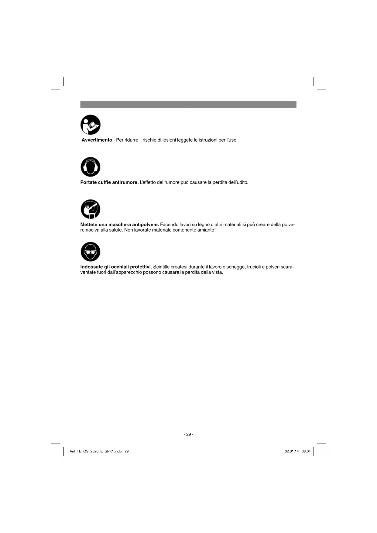 Avvertimento - Per ridurre il rischio di lesioni leggete le istruzioni per l’uso Portate cuffi e antirumore. L’e ff etto del rumore può causare la perdita dell’udito. Indossate gli occhiali protettivi. Scintille createsi durante il lavoro o schegge, trucioli e polveri scara- ventate fuori dall’apparecchio possono causare la perdita della vista. Mettete una maschera antipolvere. Facendo lavori su legno o altri materiali si può creare della polve- re nociva alla salute. Non lavorate materiale contenente amianto! Anl_TE_OS_2520_E_SPK1.indb 29Anl_TE_OS_2520_E_SPK1.indb 29 02.01.14 08:0402.01.14 08:04I