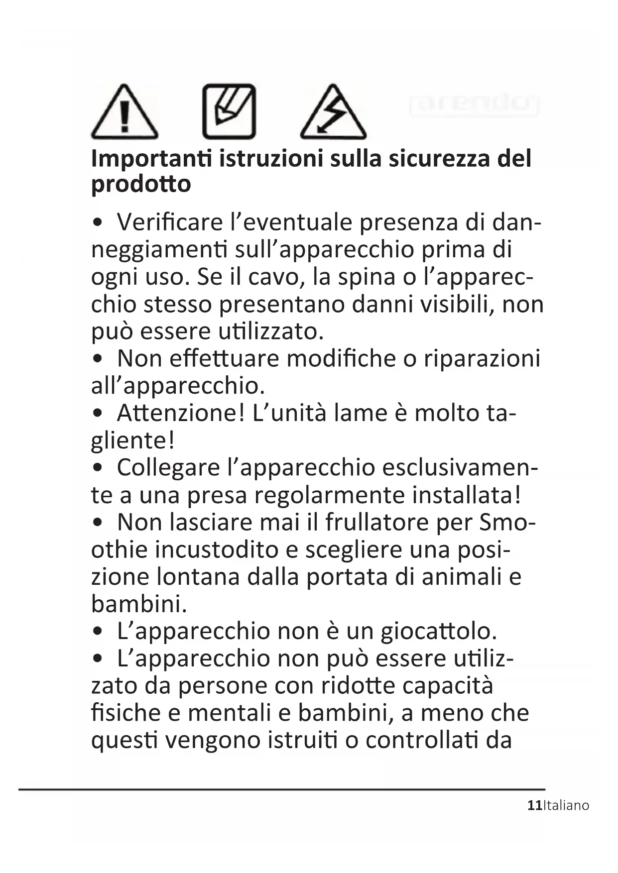 - Se il cavo è danneggiato o difeoso, deve essere sostuito dal produore o da una persona qualicata per evitare danni14 Italiano Grazie per aver scelto un prodoo di Arendo. Per ulizzare con soddisfazione l'apparecchio acquistato, si prega di leggere aentamente le seguen brevi istruzioni per l’uso. 1 Contenuto della confezione