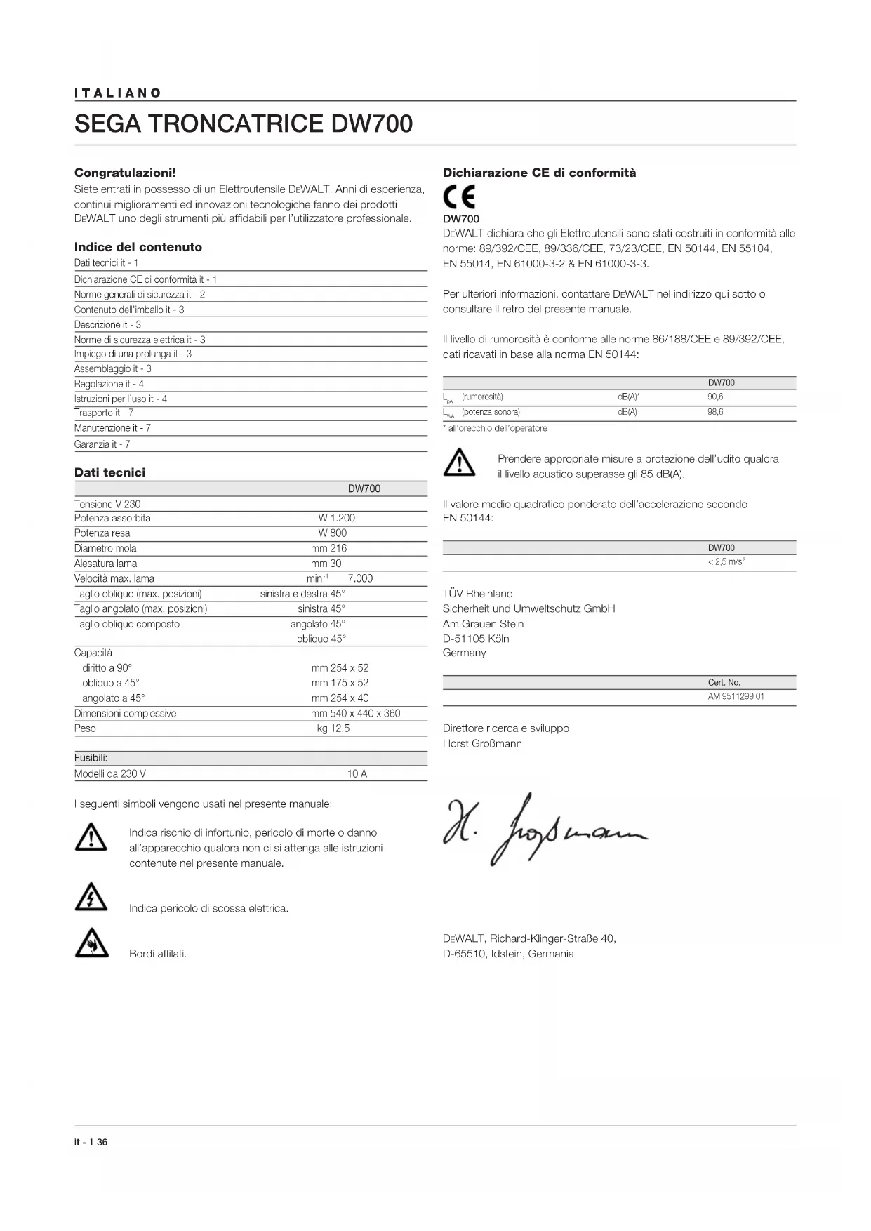 Taglio obliquo (max. posizioni) sinistra e destra 45° Taglio angolato (max. posizioni) sinistra 45° Taglio obliquo composto angolato 45° obliquo 45° Capacità diritto a 90° mm 254 x 52 obliquo a 45° mm 175 x 52 angolato a 45° mm 254 x 40 Dimensioni complessive mm 540 x 440 x 360 Peso kg 12,5 Fusibili: Modelli da 230 V 10 A I seguenti simboli vengono usati nel presente manuale: Indica rischio di infortunio, pericolo di morte o danno all’apparecchio qualora non ci si attenga alle istruzioni contenute nel presente manuale. Indica pericolo di scossa elettrica. Bordi affilati. Dichiarazione CE di conformità DW700 DEWALT dichiara che gli Elettroutensili sono stati costruiti in conformità alle norme: 89/392/CEE, 89/336/CEE, 73/23/CEE, EN 50144, EN 55104, EN 55014, EN 61000-3-2 & EN 61000-3-3. Per ulteriori informazioni, contattare DEWALT nel indirizzo qui sotto o consultare il retro del presente manuale. Il livello di rumorosità è conforme alle norme 86/188/CEE e 89/392/CEE, dati ricavati in base alla norma EN 50144: DW700