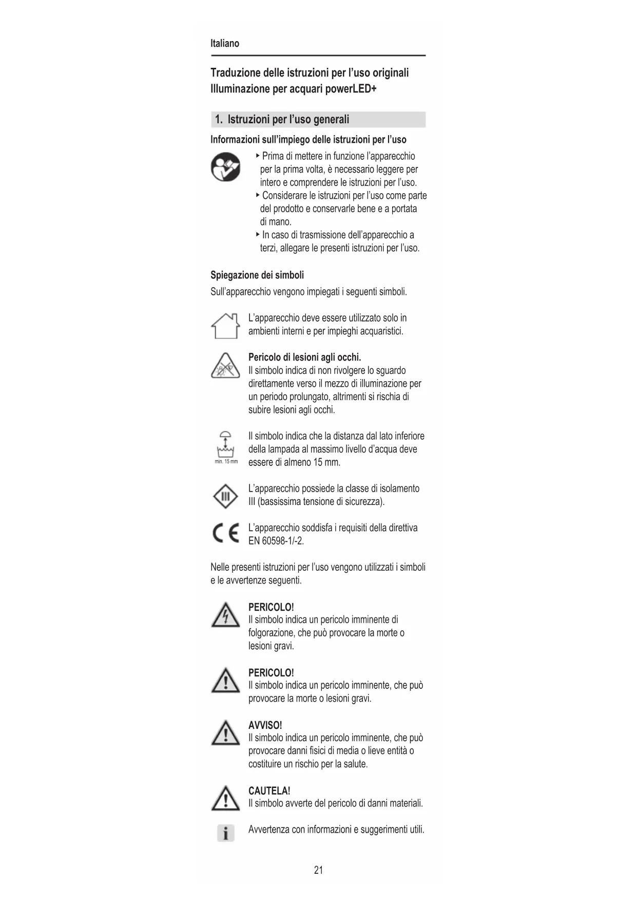 Informazioni sull’impiego delle istruzioni per l’uso ▶ Prima di mettere in funzione l’apparecchio per la prima volta, è necessario leggere per intero e comprendere le istruzioni per l’uso. ▶ Considerare le istruzioni per l’uso come parte del prodotto e conservarle bene e a portata di mano. ▶ In caso di trasmissione dell’apparecchio a terzi, allegare le presenti istruzioni per l’uso. Spiegazione dei simboli Sull’apparecchio vengono impiegati i seguenti simboli. L’apparecchio deve essere utilizzato solo in ambienti interni e per impieghi acquaristici. Pericolo di lesioni agli occhi. Il simbolo indica di non rivolgere lo sguardo direttamente verso il mezzo di illuminazione per un periodo prolungato, altrimenti si rischia di subire lesioni agli occhi. Il simbolo indica che la distanza dal lato inferiore della lampada al massimo livello d’acqua deve essere di almeno 15 mm. L’apparecchio possiede la classe di isolamento III (bassissima tensione di sicurezza). L’apparecchio soddisfa i requisiti della direttiva EN 60598-1/-2. Nelle presenti istruzioni per l’uso vengono utilizzati i simboli e le avvertenze seguenti. PERICOLO! Il simbolo indica un pericolo imminente di folgorazione, che può provocare la morte o lesioni gravi. PERICOLO! Il simbolo indica un pericolo imminente, che può provocare la morte o lesioni gravi. AVVISO! Il simbolo indica un pericolo imminente, che può provocare danni sici di media o lieve entità o costituire un rischio per la salute. CAUTELA! Il simbolo avverte del pericolo di danni materiali. Avvertenza con informazioni e suggerimenti utili. min. 15 mmItaliano
