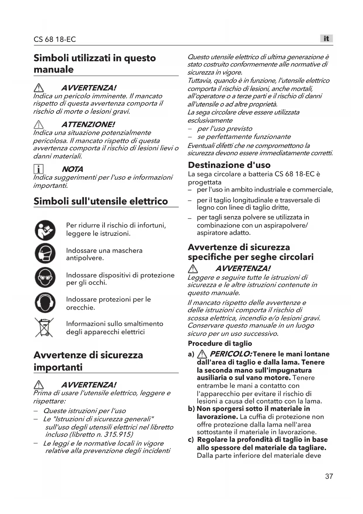 Pulire periodicamente l'utensile elettrico e le aperture di ventilazione. La frequenza della pulizia dipende dal tipo di materiale lavorato e dalla frequenza di utilizzo. Pulire l'interno dell'involucro e il motore con aria compressa.45 CS 68 18-EC Riparazioni Qualsiasi operazione di riparazione deve essere affidata a un centro di assistenza autorizzato. Parti di ricambio e accessori Ulteriori accessori e utensili sono disponibili nei cataloghi del costruttore. Le viste esplose e l'elenco delle parti di ricambio sono disponibili sul nostro sito web: www.flex-tools.com. Informazioni sullo smaltimento AVVERTENZA! Rendere inutilizzabili gli utensili elettrici come descritto di seguito. Per gli utensili cordless: rimuovere la batteria. Solo Paesi UENon smaltire l'utensile elettrico insieme ai rifiuti domestici.Ai sensi della direttiva europea 2012/19/EU sui rifiuti di apparecchiature elettriche ed elettroniche e della sua applicazione nella giurisdizione nazionale, gli apparecchi elettrici devono essere raccolti separatamente e riciclati nel rispetto dell'ambiente.Riciclare le materie prime invece di smaltirle insieme ai rifiuti.L'apparecchio, gli accessori e i materiali di imballaggio devono essere smaltiti nel rispetto dell'ambiente. Le parti in plastica sono riciclabili in base al tipo di materiale. AVVERTENZA! Non gettare le batterie insieme ai rifiuti domestici, nel fuoco o nell'acqua. Non aprire le batterie usate. Solo Paesi UE Ai sensi della direttiva 2006/66/EC, le batterie usate o difettose devono essere riciclate. NOTA Rivolgersi al rivenditore per informazioni sullo smaltimento. -Dichiarazione di conformità Si dichiara sotto propria responsabilità che il prodotto descritto alla sezione "Specifiche tecniche" è conforme ai seguenti standard o documenti normativi.EN 62841 ai sensi dei regolamenti delle direttive 2014/30/EU, 2006/42/EG, 2011/65/EU.Responsabile dei documenti tecnici: FLEX-Elektrowerkzeuge GmbH, R & D Bahnhofstrasse 15, D-71711 Steinheim/MurrPeter Lameli Klaus Peter WeinperResponsabile Responsabile dell'Ufficio tecnico Qualità (UQ)22.12.2023; FLEX-Elektrowerkzeuge GmbHBahnhofstrasse 15, D-71711 Steinheim/Murr Esonero dalla responsabilità Il costruttore e il suo rappresentante non sono responsabili per danni e mancato profitto a causa dell'interruzione dell'attività commerciale dovuta al prodotto o a un prodotto inutilizzabile.Il costruttore e il suo rappresentante non sono responsabili per danni causati dall'uso improprio del prodotto o dall'uso del prodotto con accessori di altri costruttori.46 CS 68 18-EC Símbolos utilizados en este manual ¡ADVERTENCIA! Indica un peligro inminente. Si no se tiene en cuenta esta advertencia puede producirse la muerte o lesiones muy graves. ¡PRECAUCIÓN! Indica la posibilidad de una situación de peligro. Si no se tiene en cuenta esta advertencia pueden producirse lesiones leves o daños materiales. NOTA Indica consejos de aplicación e información importante. Símbolos en la herramienta eléctrica ¡Para reducir el riesgo de lesiones, lea el manual de instrucciones!¡Llevar máscara!¡Utilizar protección ocular!¡Utilizar protección auditiva!Información para la eliminación de la herramienta vieja Información importante para la seguridad ¡ADVERTENCIA! Antes de usar la herramienta eléctrica, lea los documentos siguientes: estas instrucciones de funcionamiento, las «Instrucciones generales de seguridad» sobre el manejo de herramientas eléctricas incluidas en el folleto adjunto (n.º: 315.915), los reglamentos locales vigentes actualmente y las normativas sobre prevención de accidentes. Esta herramienta eléctrica incorpora la tecnología más avanzada y ha sido fabricada cumpliendo las normativas de seguridad reconocidas. No obstante, cuando se utiliza la herramienta eléctrica, podría producirse un riesgo para la integridad física y la vida del usuario y de terceros, o daños en la herramienta u otros daños materiales. La sierra circular solo puede utilizarse para el uso previsto en perfecto estado de funcionamiento. Los fallos que afecten a la seguridad deben repararse inmediatamente. Uso previsto La sierra circular inalámbrica CS 68 18-EC está diseñada