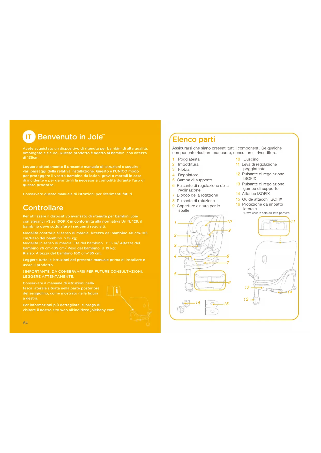 Avete acquistato un dispositivo di ritenuta per bambini di alta qualità﹐ omologato e sicuro. Questo prodotto è adatto ai bambini con altezza di 135cm.Leggere attentamente il presente manuale di istruzioni e seguire i vari passaggi della relativa installazione. Questo è l’UNICO modo per proteggere il vostro bambino da lesioni gravi o mortali in caso di incidente e per garantirgli la necessaria comodità durante l’uso di questo prodotto.Conservare questo manuale di istruzioni per riferimenti futuri. Controllare Per utilizzare il dispositivo avanzato di ritenuta per bambini Joie con agganci i-Size ISOFIX in conformità alla normativa Un N. 129﹐ il bambino deve soddisfare i seguenti requisiti.Modalità contraria al senso di marcia: Altezza del bambino 40 cm-105 cm/Peso del bambino 19 kg; Modalità in senso di marcia: Età del bambino 15 m/ Altezza del bambino 76 cm-105 cm/ Peso del bambino 19 kg; Rialzo: Altezza del bambino 100 cm-135 cm;Leggere tutte le istruzioni del presente manuale prima di installare e usare il prodotto.! IMPORTANTE: DA CONSERVARSI PER FUTURE CONSULTAZIONI. LEGGERE ATTENTAMENTE.Conservare il manuale di istruzioni nella tasca laterale situata nella parte posteriore del seggiolino﹐ come mostrato nella figura a destra.Per informazioni più dettagliate﹐ si prega di visitare il nostro sito web all'indirizzo joiebaby.com Elenco parti 1 Poggiatesta2 Imbottitura3 Fibbia4 Regolatore5 Gamba di supporto6 Pulsante di regolazione della reclinazione7 Blocco della rotazione8 Pulsante di rotazione9 Coperture cintura per le spalle10 Cuscino11 Leva di regolazione poggiatesta12 Pulsante di regolazione ISOFIX13 Pulsante di regolazione gamba di supporto14 Attacco ISOFIX15 Guide attacchi ISOFIX16 Protezione da impatto laterale*Deve essere solo sul lato portieraAssicurarsi che siano presenti tutti i componenti. Se qualche componente risultare mancante, consultare il rivenditore.