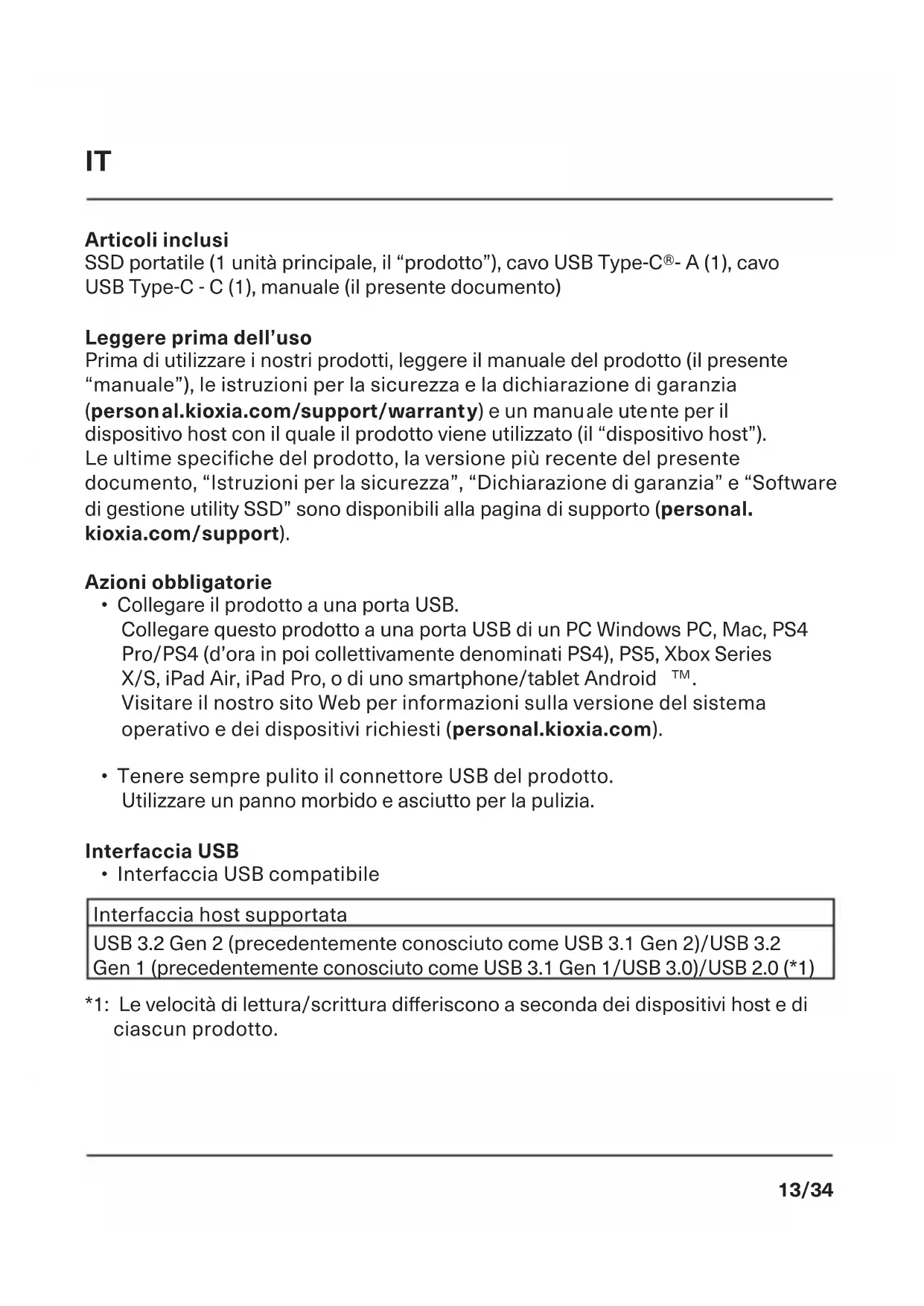 L’uso di questo simbolo indica che questo prodotto non può essere trattato come un normale riuto domestico. Garantire il corretto smaltimento di questo prodotto, contribuisce a evitare potenziali conseguenze negative per l’ambiente e per la salute umana, conseguenze che si potrebbero vericare con una gestione scorretta del prodotto al termine del ciclo di vita. Per informazioni più approfondite in merito al riciclaggio di questo prodotto contattare l’ucio comunale di zona, il servizio di smaltimento riuti domestici o il negozio presso il quale è stato acquistato il dispositivo. SUPPORTO TECNICO C’è bisogno di aiuto? Contattateci alla nostra pagina di supporto regionale: personal.kioxia.com/support16/34 Artículos incluidos SSD portátil (1 unidad principal, el “Producto”), USB Type-C® - Cable A (1), USB Type-C - Cable C (1), Manual (este documento) Lea antes del uso Antes de utilizar nuestros Productos, lea el manual del Producto (este “Manual”), las Instrucciones de seguridad y la Declaración de garantía (personal.kioxia.com/support/warranty) y el manual del usuario del dispositivo antrión con el que se utiliza el Producto (el “Dispositivo antrión”). La última especicación del producto, la última versión de este documento, las “Instrucciones de seguridad”, la “Declaración de garantía” y el “Software de gestión de las utilidades del SSD” se pueden encontrar en la página de soporte (personal.kioxia.com/support). Acciones obligatorias