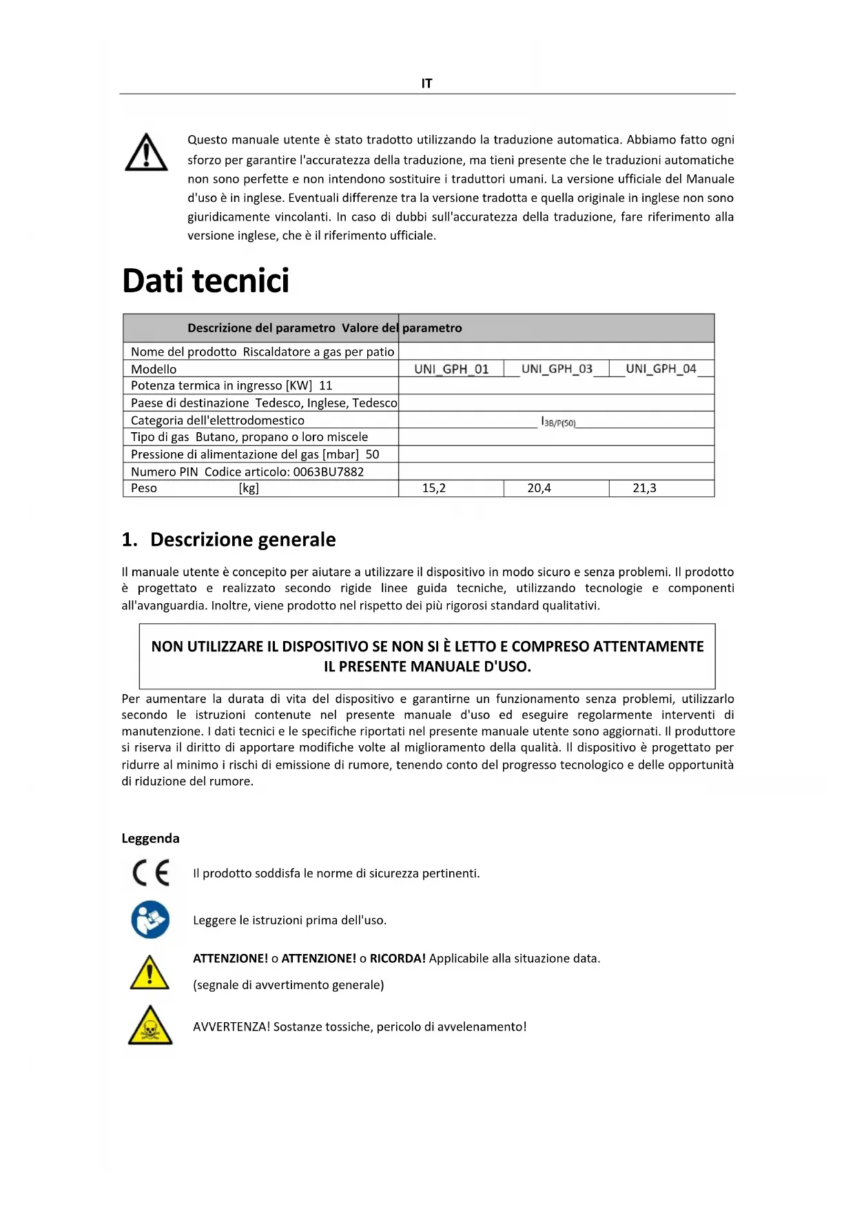 Il manuale utente è concepito per aiutare a utilizzare il dispositivo in modo sicuro e senza problemi. Il prodotto è progettato e realizzato secondo rigide linee guida tecniche, utilizzando tecnologie e componenti all'avanguardia. Inoltre, viene prodotto nel rispetto dei più rigorosi standard qualitativi. NON UTILIZZARE IL DISPOSITIVO SE NON SI È LETTO E COMPRESO ATTENTAMENTE IL PRESENTE MANUALE D'USO. Per aumentare la durata di vita del dispositivo e garantirne un funzionamento senza problemi, utilizzarlo secondo le istruzioni contenute nel presente manuale d'uso ed eseguire regolarmente interventi di manutenzione. I dati tecnici e le specifiche riportati nel presente manuale utente sono aggiornati. Il produttore si riserva il diritto di apportare modifiche volte al miglioramento della qualità. Il dispositivo è progettato per ridurre al minimo i rischi di emissione di rumore, tenendo conto del progresso tecnologico e delle opportunità di riduzione del rumore. Leggenda Il prodotto soddisfa le norme di sicurezza pertinenti. Leggere le istruzioni prima dell'uso. ATTENZIONE! o ATTENZIONE! o RICORDA! Applicabile alla situazione data. (segnale di avvertimento generale) AVVERTENZA! Sostanze tossiche, pericolo di avvelenamento!IT Non toccare! ATTENZIONE! Superficie calda, rischio di ustioni! ATTENZIONE! I disegni presenti nel presente manuale hanno solo scopo illustrativo e potrebbero differire in alcuni dettagli dal prodotto reale.