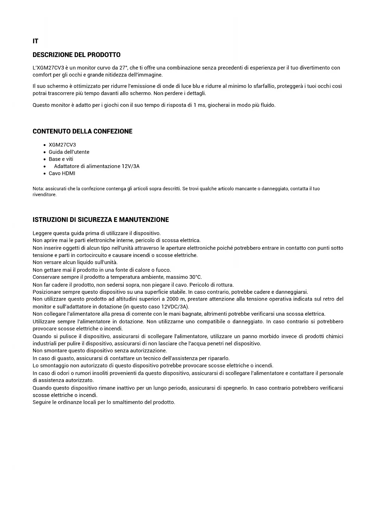 Scarica le istruzioni per il tuo Monitor in formato PDF gratuitamente! Trova il tuo manuale XGM27CV3 - KeepOut e riprendi in mano il tuo dispositivo elettronico. In questa pagina sono pubblicati tutti i documenti necessari per l'utilizzo del tuo dispositivo. XGM27CV3 del marchio KeepOut.