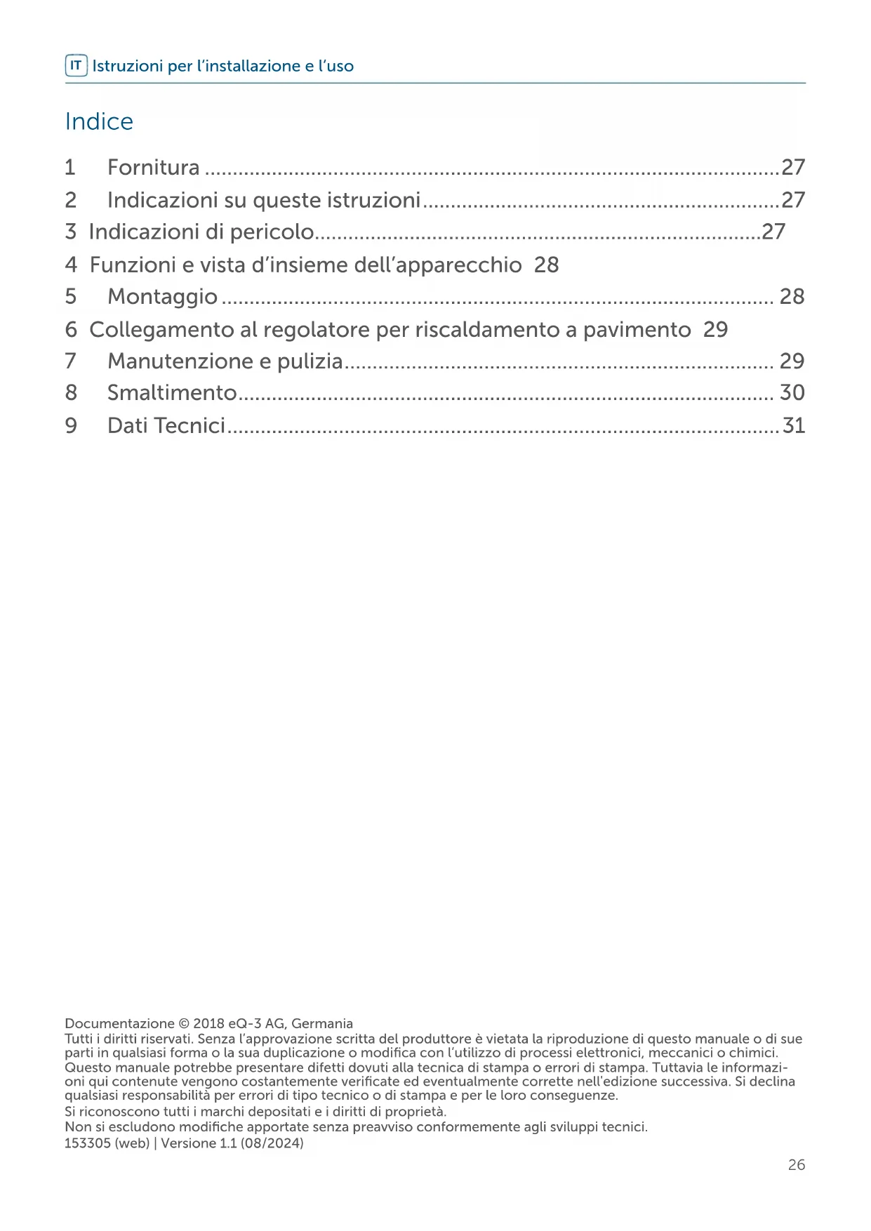 - Allacciare il cavo di collegamento dell’attuatore agli appositi morsetti dell’attuatore per riscaldamento a pavimento. Figura 5 7 Manutenzione e pulizia Questo apparecchio non richiede manutenzione. Per le riparazioni rivolgersi a un tecnico specializ- zato. Pulire l’apparecchio con un panno morbido, pulito, asciutto e privo di pe- lucchi. Non utilizzare detergenti a base di solventi poiché potrebbero danneg- giare la scatola esterna di plastica e le iscrizioni sull’apparecchio.30 Smaltimento 8 Smaltimento Avvertenze per lo smaltimento Questo simbolo significa che l’ap- parecchio non va smaltito con i rifiuti domestici, nel bidone dei rifiuti o nel bidone o sacco giallo. Ai fini della tutela della salute e dell’ambiente, per un corretto smalti- mento siete tenuti a conferire il pro- dotto e tutte le parti elettroniche in- cluse in dotazione presso un centro di raccolta comunale per apparecchi elettrici ed elettronici usati. Anche i distributori di apparecchi elettrici ed elettronici sono tenuti a ritirare gli ap- parecchi usati gratuitamente. Con la raccolta dierenziata date un prezioso contributo per il riutilizzo, il riciclo e altre forme di recupero di ap- parecchi usati. Ricordiamo espressamente che l’uten- te finale è responsabile personalmente della cancellazione dei dati personali negli apparecchi elettrici ed elettronici da smaltire. Dichiarazione di conformità Il marchio CE è un contrassegno del mercato libero, che si rivolge esclusivamente agli enti uciali e che non rappresenta una garanzia delle caratteristiche del prodotto. Per domande di tipo tecnico sull’apparecchio rivolgersi al pro- prio rivenditore specializzato.31 Dati Tecnici 9 Dati Tecnici Sigla dell’apparecchio: HmIP-VDMOT Tensione di alimentazione: 3,3 VDC, SELV Corrente assorbita: 120 mA max. Grado di protezione: IP20 Classe di protezione: III Temperatura ambiente: tra 0 e 50 °C Modalità funzionamento: Tipo 1 Attacco: M30 x 1,5 mm Grado di contaminazione: 2 Corsa lineare: 4,3 ±0,3 mm Dimensioni: 44 x 54 x 50 mm (senza cavo di colle- gamento) Peso: 80 g Con riserva di modifiche tecniche.32 Documentatie © 2018 eQ-3 AG, Duitsland Alle rechten voorbehouden. Zonder schriftelijke toestemming van de uitgever mogen deze handleiding of fragmen- ten ervan op geen enkele manier worden gereproduceerd of met behulp van elektronische, mechanische of chemi- sche middelen worden verveelvoudigd of verwerkt. Het is mogelijk dat deze handleiding nog druktechnische gebreken of drukfouten vertoont. De gegevens in deze handleiding worden echter regelmatig gecontroleerd en indien nodig in de volgende uitgave gecorrigeerd. Voor fouten van technische of druktechnische aard inclusief de gevolgen ervan stellen wij ons niet aansprakelijk. Alle handelsmerken en octrooirechten worden erkend. Wijzigingen die de technische vooruitgang dienen, zijn zonder voorafgaande aankondiging mogelijk. 153305 (web) | Versie 1.1 (08/2024) Installatie- en bedieningshandleiding