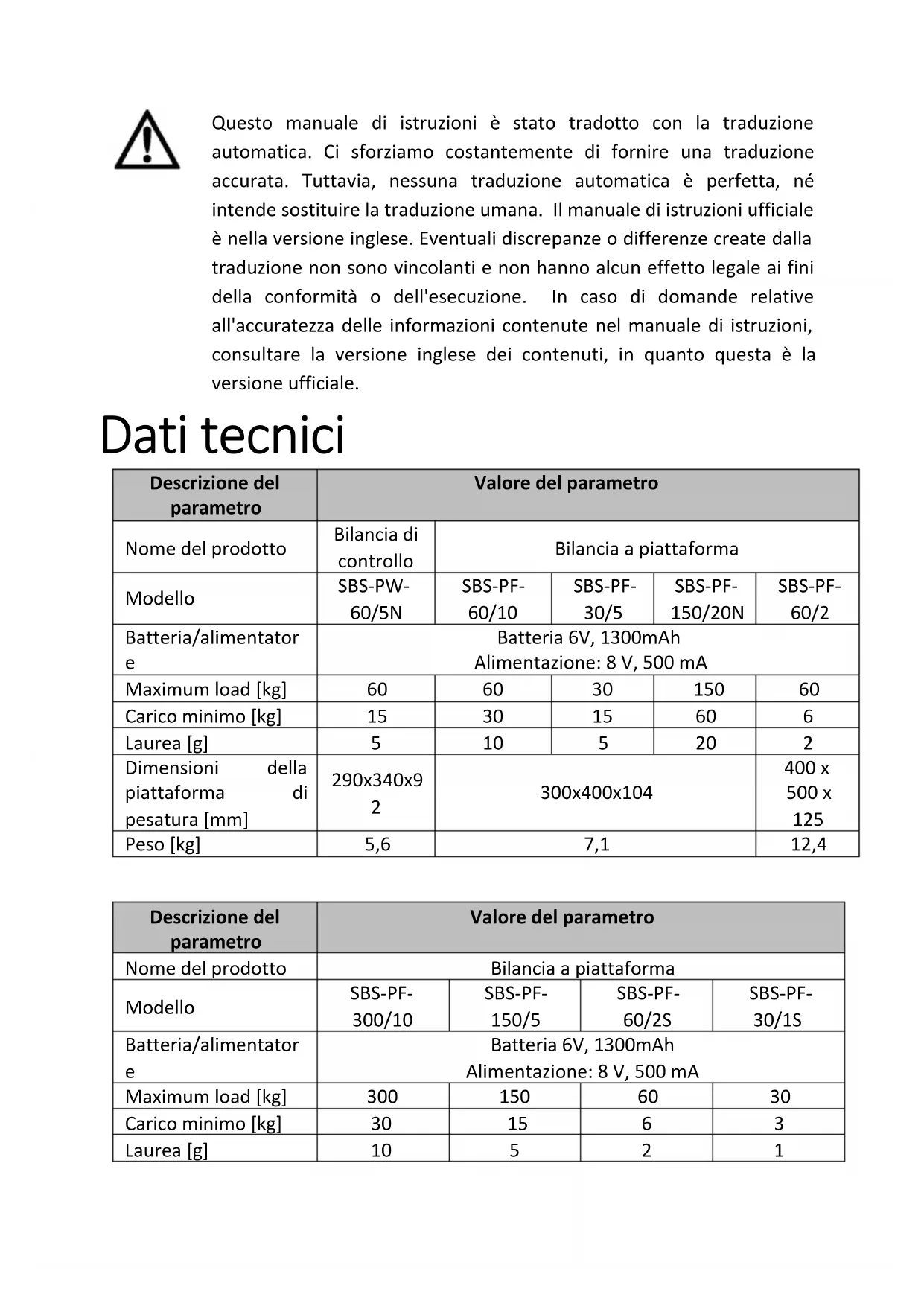 j) Non utilizzare oggetti appuntiti e/o metallici (es. spazzole metalliche o spatole metalliche) in quanto potrebbero danneggiare la superficie del materiale di cui è composto il dispositivo. k) Non pulire il prodotto con sostanze acide, agenti medici, diluenti, carburante, oli o altri prodotti chimici. Potrebbe causare danni al dispositivo. ISTRUZIONI PER LA RIMOZIONE SICURA DELLA BATTERIA: I dispositivi sono dotati di batterie da 6 V, 1300 mAh. La batteria usata deve essere rimossa dal dispositivo seguendo la stessa procedura della sua installazione. Consegnare le batterie usate alla cellula responsabile dello smaltimento di questi materiali. SMALTIMENTO DELLE APPARECCHIATURE USURATE. Alla fine della sua vita utile, questo prodotto non deve essere smaltito con i normali rifiuti urbani ma va affidato a un centro di raccolta di apparecchiature elettriche ed elettroniche. Lo segnala il simbolo, collocato sul prodotto, sulle istruzioni per l'uso o sull'imballaggio. Le materie plastiche utilizzate nel dispositivo sono adatte al riutilizzo secondo la loro etichettatura. Riutilizzando, riproponendo o utilizzando in altro modo l'attrezzatura usurata, si contribuisce alla tutela del nostro ambiente naturale. Per informazioni sull’impianto adatto per lo smaltimento dei dispositivi usurati, contattare gli organi della vostra amministrazione locale.Este manual de instrucciones ha sido traducido automáticamente. Nos esforzamos constantemente por ofrecer una traducción precisa. Sin embargo, ninguna traducción automática es perfecta. Tampoco pretende sustituir a la traducción realizada por un ser humano. El manual de instrucciones oficial es la versión inglesa. Cualquier discrepancia o diferencia en la traducción no es vinculante ni tiene ningún efecto legal a efectos de cumplimiento o ejecución. En caso de duda sobre la exactitud de la información incluida en las instrucciones de uso, consulte la versión inglesa de estos contenidos, ya que esta es la versión oficial. Características técnicas Descripción del parámetro Valor del parámetro Nombre del producto Balanza de control Báscula de plataforma Modelo SBS-PW-60 / 5N SBS-PF- 60/10 SBS-PF- 30/5 SBS-PF- 150 / 20N SBS-PF- 60/2 Batería / fuente de alimentación Batería 6V, 1300mAh Fuente de alimentación: 8 V, 500 mA Maximum load [kg]