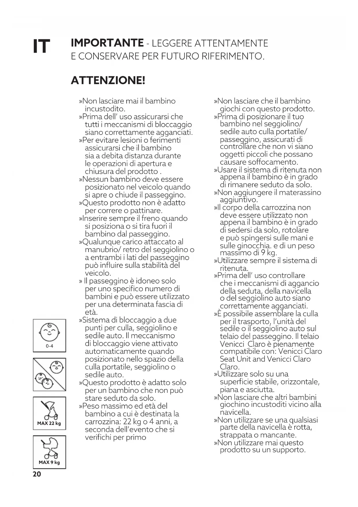 E CONSERVARE PER FUTURO RIFERIMENTO. ATTENZIONE! » Non lasciare mai il bambino incustodito. » Prima dell’ uso assicurarsi che tutti i meccanismi di bloccaggio siano correttamente agganciati. » Per evitare lesioni o ferimenti assicurarsi che il bambino sia a debita distanza durante le operazioni di apertura e chiusura del prodotto . » Nessun bambino deve essere posizionato nel veicolo quando si apre o chiude il passeggino. » Questo prodotto non è adatto per correre o pattinare. » Inserire sempre il freno quando si posiziona o si tira fuori il bambino dal passeggino. » Qualunque carico attaccato al manubrio/ retro del seggiolino o a entrambi i lati del passeggino può influire sulla stabilità del veicolo. » Il passeggino è idoneo solo per uno specifico numero di bambini e può essere utilizzato per una determinata fascia di età. » Sistema di bloccaggio a due punti per culla, seggiolino e sedile auto. Il meccanismo di bloccaggio viene attivato automaticamente quando posizionato nello spazio della culla portatile, seggiolino o sedile auto. » Questo prodotto è adatto solo per un bambino che non può stare seduto da solo. » Peso massimo ed età del bambino a cui è destinata la carrozzina: 22 kg o 4 anni, a seconda dell’evento che si verifichi per primo » Non lasciare che il bambino giochi con questo prodotto. » Prima di posizionare il tuo bambino nel seggiolino/ sedile auto culla portatile/ passeggino, assicurati di controllare che non vi siano oggetti piccoli che possano causare soffocamento. » Usare il sistema di ritenuta non appena il bambino è in grado di rimanere seduto da solo. » Non aggiungere il materassino aggiuntivo. » Il corpo della carrozzina non deve essere utilizzato non appena il bambino è in grado di sedersi da solo, rotolare e può spingersi sulle mani e sulle ginocchia. e di un peso massimo di 9 kg. » Utilizzare sempre il sistema di ritenuta. » Prima dell’ uso controllare che i meccanismi di aggancio della seduta, della navicella o del seggiolino auto siano correttamente agganciati. » È possibile assemblare la culla per il trasporto, l’unità del sedile o il seggiolino auto sul telaio del passeggino. Il telaio Venicci Claro è pienamente compatibile con: Venicci Claro Seat Unit and Venicci Claro Claro. » Utilizzare solo su una superficie stabile, orizzontale, piana e asciutta. » Non lasciare che altri bambini giochino incustoditi vicino alla navicella. » Non utilizzare se una qualsiasi parte della navicella è rotta, strappata o mancante. » Non utilizzare mai questo prodotto su un supporto.21