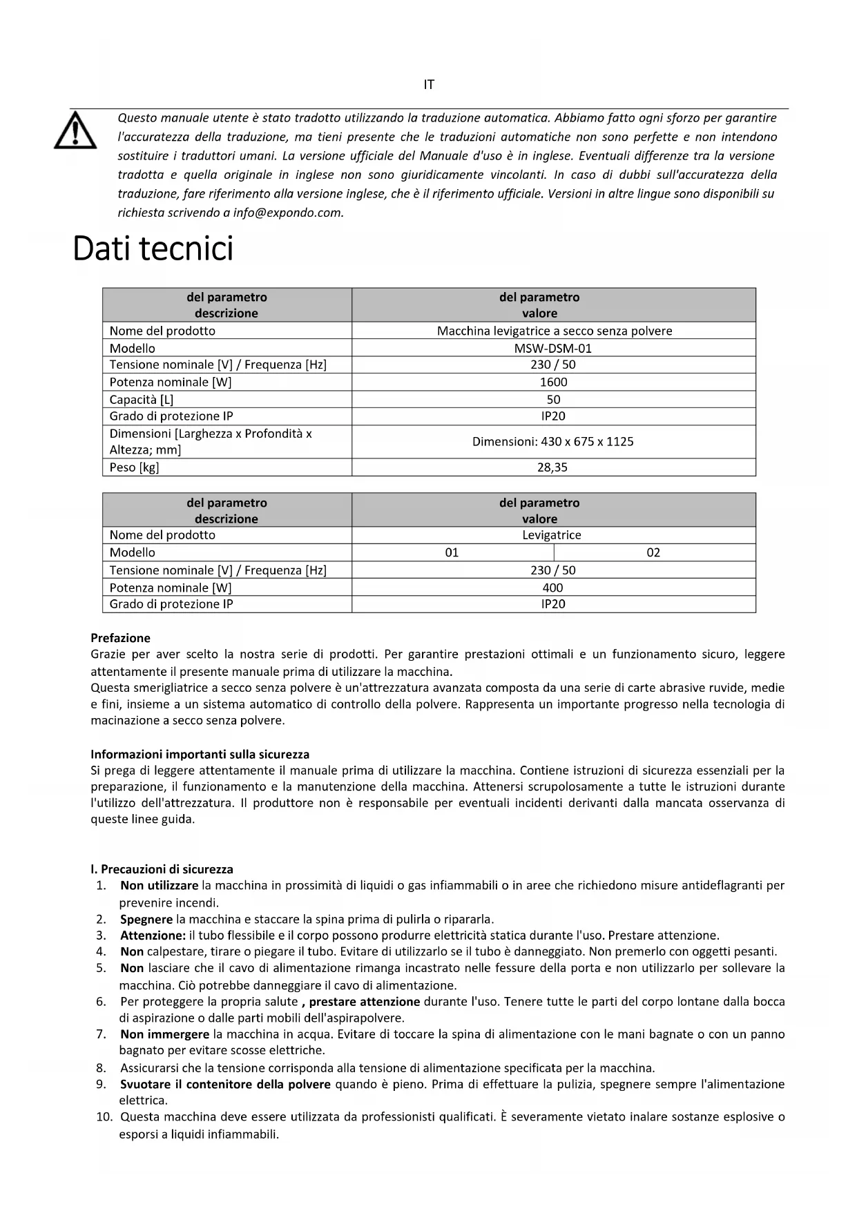 Questo manuale utente è stato tradotto utilizzando la traduzione automatica. Abbiamo fatto ogni sforzo per garantire l'accuratezza della traduzione, ma tieni presente che le traduzioni automatiche non sono perfette e non intendono sostituire i traduttori umani. La versione ufficiale del Manuale d'uso è in inglese. Eventuali differenze tra la versione tradotta e quella originale in inglese non sono giuridicamente vincolanti. In caso di dubbi sull'accuratezza della traduzione, fare riferimento alla versione inglese, che è il riferimento ufficiale. Versioni in altre lingue sono disponibili su richiesta scrivendo a info@expondo.com. Dati tecnici del parametro descrizione del parametro valore Nome del prodotto Macchina levigatrice a secco senza polvere Modello MSW-DSM-01 Tensione nominale [V] / Frequenza [Hz] 230 / 50 Potenza nominale [W]