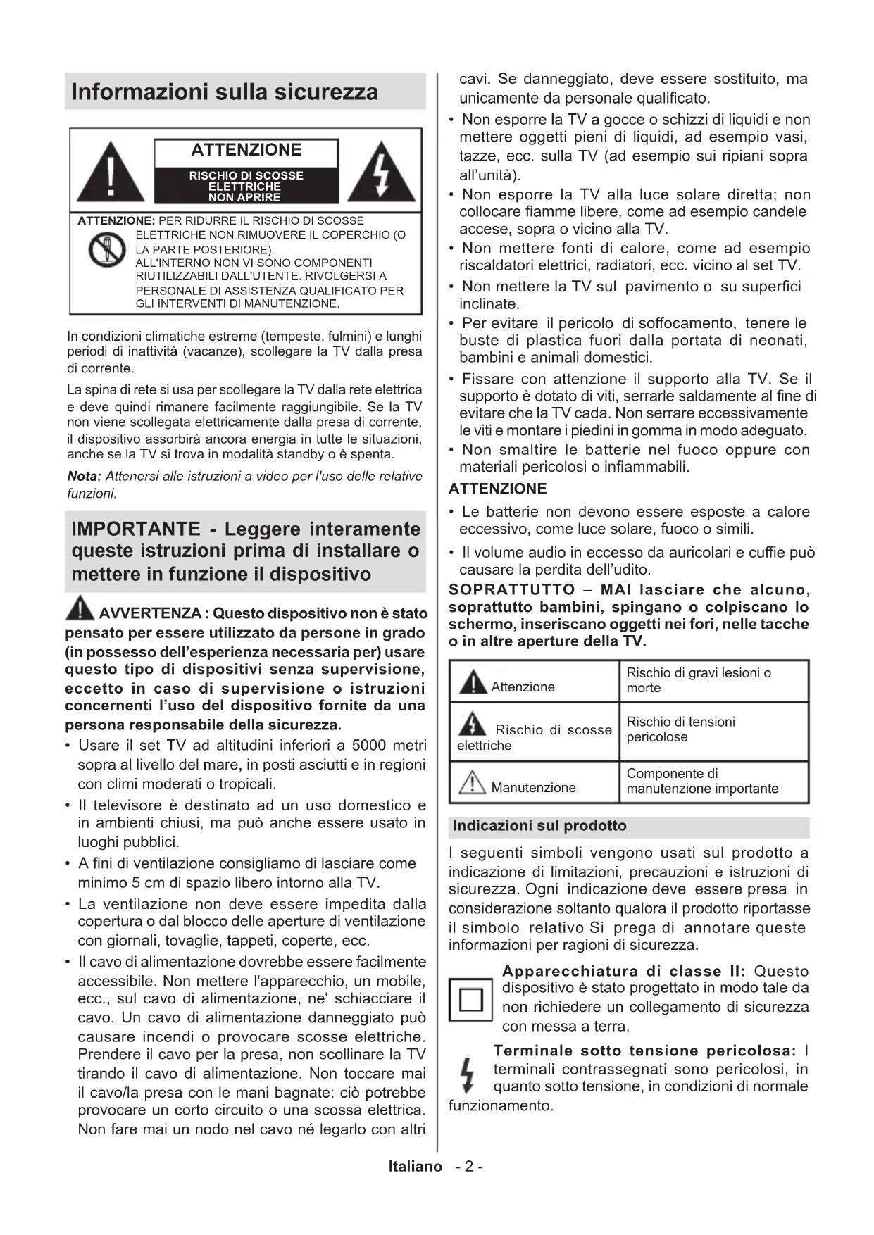 causare la perdita dell’udito. SOPRATTUTTO – MAI lasciare che alcuno, soprattutto bambini, spingano o colpiscano lo schermo, inseriscano oggetti nei fori, nelle tacche o in altre aperture della TV. Attenzione Rischio di gravi lesioni o morte Rischio di scosse elettricheRischio di tensioni pericolose Manutenzione Componente di manutenzione importante Indicazioni sul prodotto I seguenti simboli vengono usati sul prodotto a indicazione di limitazioni, precauzioni e istruzioni di