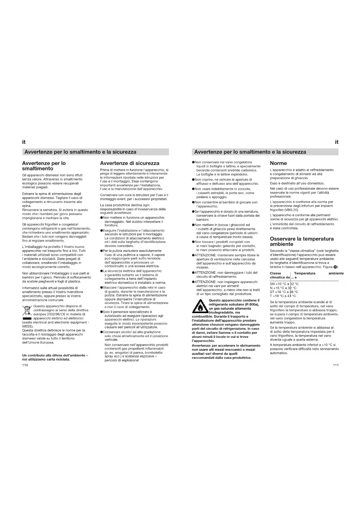 Classe Temperatura ambiente climatica da ... a SN +10 °C a 32 °C N +16 °C a 32 °C ST +18 °C a 38 °C T +18 °C a 43 °C Se la temperatura ambiente scende al di sotto del campo di temperatura, nel vano frigorifero la temperatura si abbassa troppo, se supera il campo di temperatura ambiente, nel vano congelatore la temperatura aumenta troppo. Se la temperatura ambiente si abbassa al di sotto della temperatura impostata per il vano frigorifero, la temperatura nel vano diventa uguale a quella esterna. A temperature ambiente inferiori a +10 °C si possono verificare difficoltà nello sbrinamento automatico. Avvertenze per lo smaltimento e la sicurezza