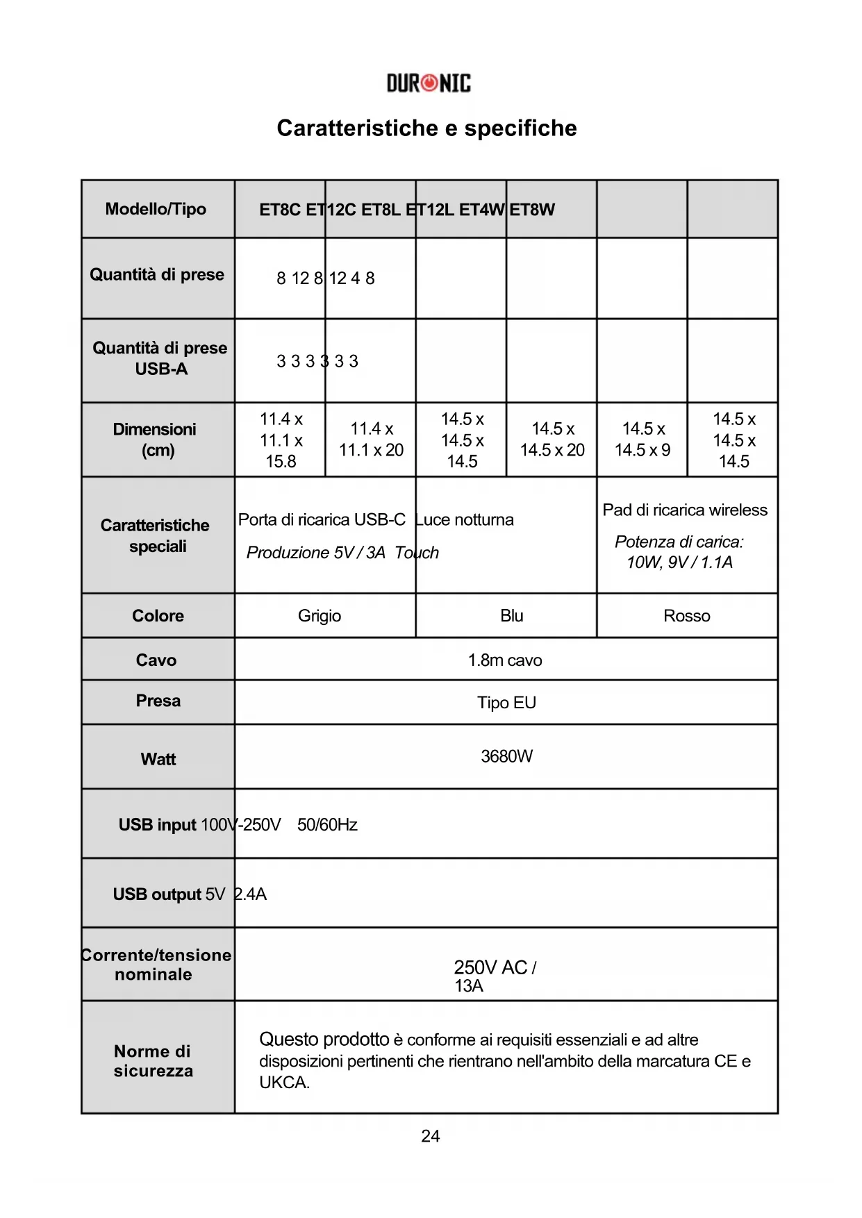 Produzione 5V / 3A Touch 10W, 9V / 1.1A Blu 1.8m cavo Watt 3680W USB input 100V-250V 50/60Hz USB output 5V 2.4A 250V AC / 13A Caratteristiche speciali Colore Modello/Tipo Porta di ricarica USB-C Luce notturna Pad di ricarica wireless Grigio Rosso Cavo Presa Tipo EU Potenza di carica: Questo prodotto è conforme ai requisiti essenziali e ad altre disposizioni pertinenti che rientrano nell'ambito della marcatura CE e UKCA. Corrente/tensione nominale Norme di sicurezza25