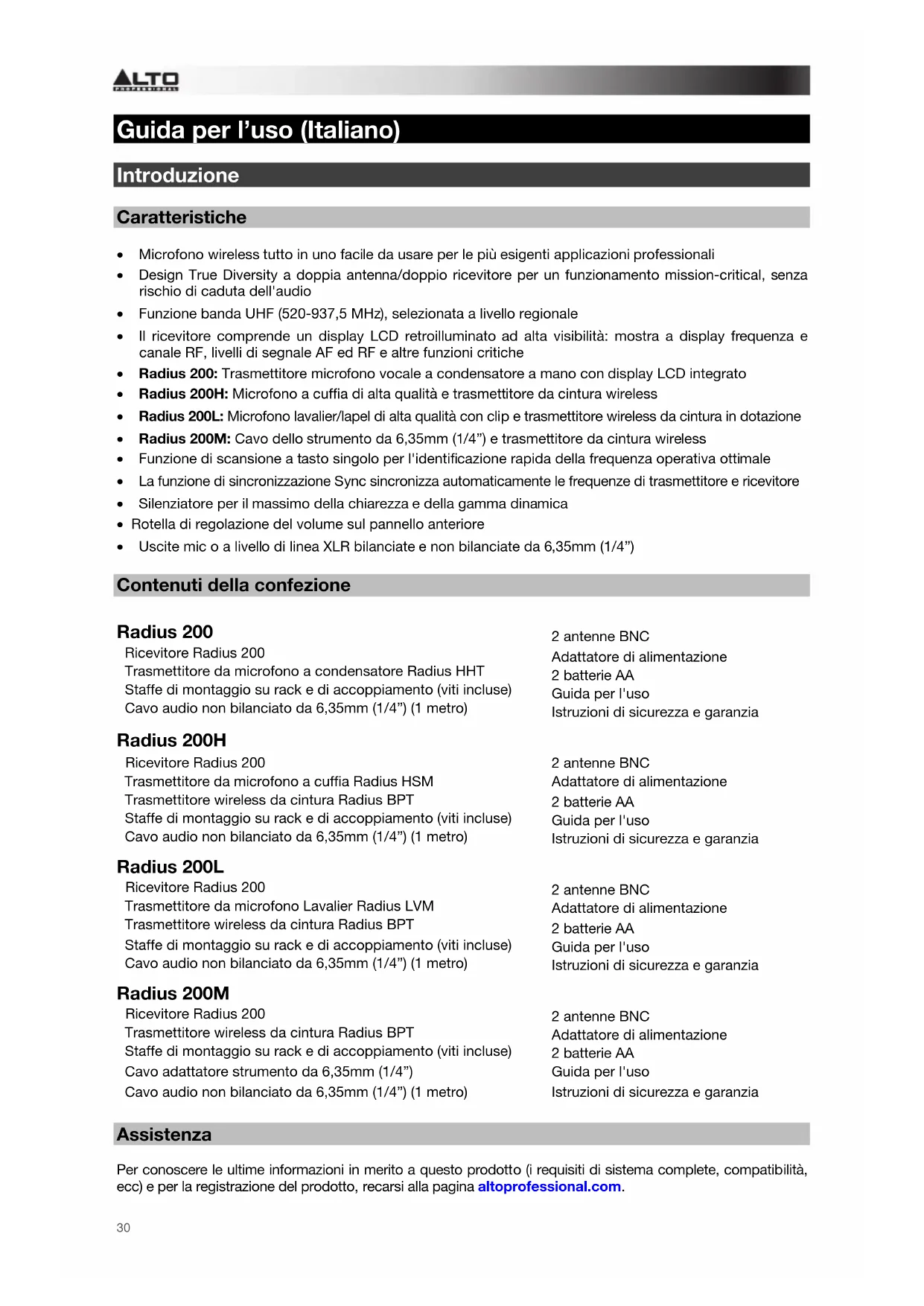 2 antenne BNC Adattatore di alimentazione 2 batterie AA Guida per l'uso Istruzioni di sicurezza e garanzia Radius 200M Ricevitore Radius 200 Trasmettitore wireless da cintura Radius BPT Staffe di montaggio su rack e di accoppiamento (viti incluse) Cavo adattatore strumento da 6,35mm (1/4”) Cavo audio non bilanciato da 6,35mm (1/4”) (1 metro) 2 antenne BNC Adattatore di alimentazione 2 batterie AA Guida per l'uso Istruzioni di sicurezza e garanzia Assistenza Per conoscere le ultime informazioni in merito a questo prodotto (i requisiti di sistema complete, compatibilità, ecc) e per la registrazione del prodotto, recarsi alla pagina altoprofessional.com.31