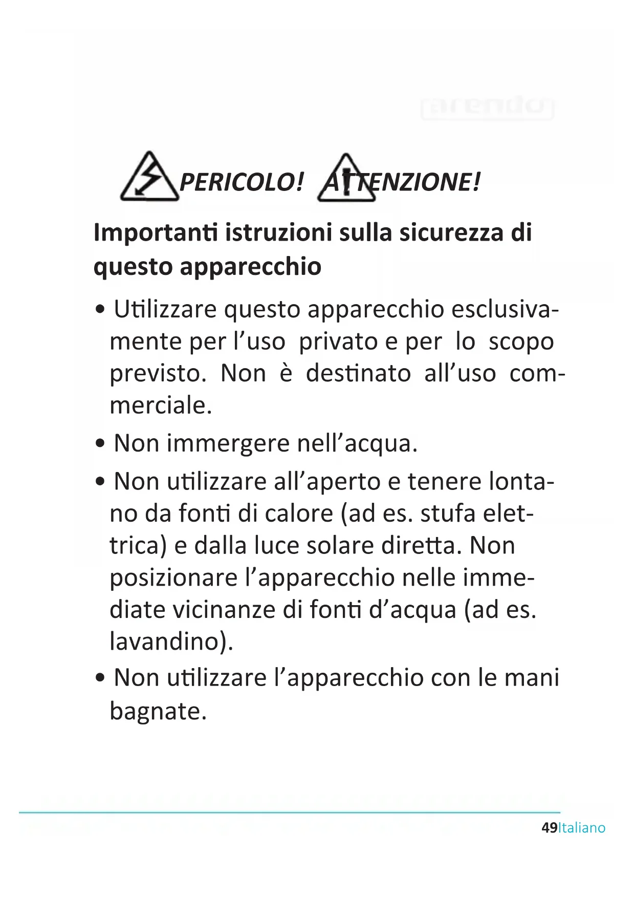 - Questo apparecchio è previsto per l’uso domesco e scopi simili. In par- colare può essere ulizzato: - in cucine per dipenden in negozi, uci e altri ambien commerciali; - in tenute agricole; - da parte di clien in alberghi, motel e altre struure abitave54 Italiano Grazie per aver scelto un prodoo di Arendo. Per ulizzare con soddisfazione l'apparecchio acquistato, si prega di leggere aentamente le seguen istruzioni per l’uso. Prima della messa in funzione della merce consegnata, vericare che sia integra, esente da dife e non danneggiata.