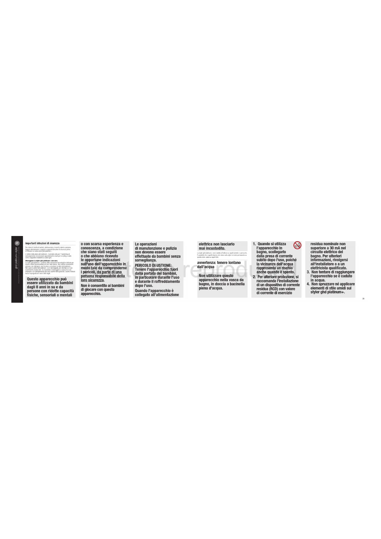 importanti istruzioni di sicurezza Per ridurre il rischio di ustioni, elettrocuzione, incendi o danni a persone, leggere attentamente e seguire le seguenti istruzioni di sicurezza prima di utilizzare la vostra styler ghd platinum+.L’utilizzo della styler ghd platinum+ è previsto solo per l’ hairstyling ed esclusivamente con accessori appositamente creati per lo styling a caldo come il tappetino resistente al calore ghd.Maneggiare la styler ghd platinum+ con curaLa styler ghd platinum+ contiene delle componenti tecnologiche delicate per questo motivo raccomandiamo di non farla cadere. Non inserire componenti estranei, non dipingere, non bruciare o smontare la styler ghd platinum+. Non usare la styler ghd platinum+ se è danneggiata, per esempio se il suo rivestimentro risulta rotto. Se il prodotto è danneggiato a causa di un uso improprio o di maltrattamento non sarà coperto dalla garanzia. Quanto indicato lascia impregiudicati i vostri diritti legali. Questo apparecchio può essere utilizzato da bambini dagli 8 anni in su e da persone con ridotte capacità siche, sensoriali o mentali o con scarsa esperienza e conoscenza, a condizione che siano stati seguiti o che abbiano ricevuto le opportune indicazioni sull'uso dell'apparecchio in modo tale da comprenderne i pericoli, da parte di una persona responsabile della loro sicurezza. Non è consentito ai bambini di giocare con questo apparecchio. Le operazioni di manutenzione e pulizia non devono essere eettuate da bambini senza sorveglianza. PERICOLO DI USTIONE: Tenere l'apparecchio fuori dalla portata dei bambini, in particolare durante l'uso e durante il rareddamento dopo l'uso. Quando l'apparecchio è collegato all'alimentazione elettrica non lasciarlo mai incustodito. La styler ghd platinum+ non è adatta all’utilizzo su capelli sintetici o parrucche. È possibile che i capelli rilascino del colore sulla styler in modo permanente se questa viene usata su capelli tinti. avvertenza: tenere lontano dall’acqua Non utilizzare questo apparecchio nella vasca da bagno, in doccia o bacinella piena d'acqua.