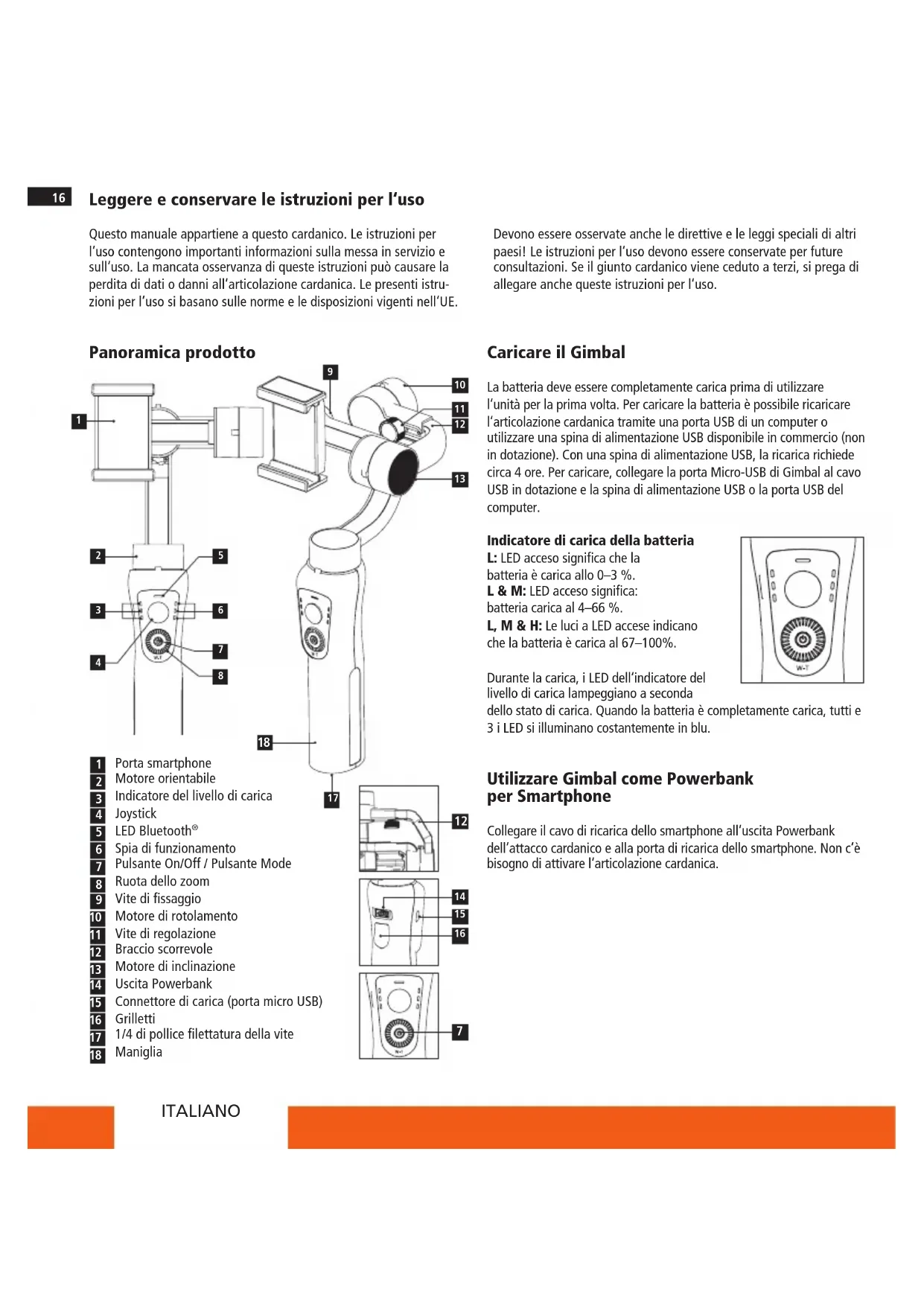 4 dBm Min. Standard Max. Vol. di ingresso 3,4 V 3,7 V 4,2 V Corrente d‘esercizio 150 mA 1500 mA 3000 mA Temperatura di esercizio 0°C 40°C Tempo di funzionamento (Ben bilanciato con telecamera montata) 12 ore Dimensioni Ca. 289x108x70 mm Peso Ca. 450 g Angolo di inclinazione 330° Angolo di rollio 160° Gamma di angoli di rotazione 330° Modelli compatibili iPhone* 13 / Mini / Pro / Pro Max iPhone* 12 / Mini / Pro / Pro Max Samsung Galaxy S22 / + / Ultra Samsung Galaxy S21 / + / Ultra Huawei P50 Pro Huawei P40 / Lite / Pro e altri smartphone con una larghezza di 53 – 88 mm (peso massimo 250 g) Angolo di inclinazione compatibile -155° +155° Angolo del rullo compatibile -30° +30° Angolo di rotazione compatibile -155° +155° Carico utile 250 g Tempo di ricarica 4 ore Tensione di carica 5 V Corrente di carica 1 A Tensione di uscita della potenza 5 V Corrente di uscita della potenza 1 A Capacità della batteria Batteria agli ioni di litio 4000 mAh Volume di fornitura Snodo cardanico, treppiede, cavo micro USB, loop, manuale utente20 ITALIANO
