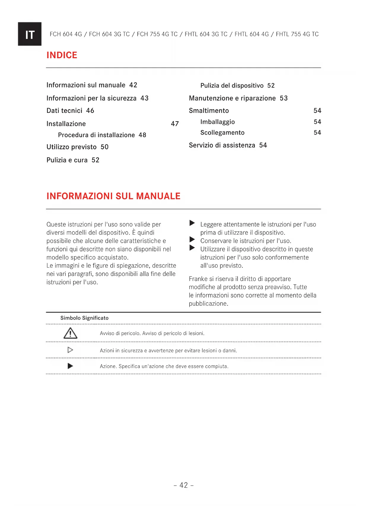 Utilizzare il dispositivo descritto in queste istruzioni per l'uso solo conformemente all'uso previsto. Franke si riserva il diritto di apportare modifiche al prodotto senza preavviso. Tutte le informazioni sono corrette al momento della pubblicazione. INDICE Informazioni sul manuale 42 Informazioni per la sicurezza 43 Dati tecnici 46 Installazione 47 Procedura di installazione 48 Utilizzo previsto 50 Pulizia e cura 52 Pulizia del dispositivo 52 Manutenzione e riparazione 53 Smaltimento 54 Imballaggio 54 Scollegamento 54 Servizio di assistenza 54– 43 – FCH 604 4G / FCH 604 3G TC / FCH 755 4G TC / FHTL 604 3G TC / FHTL 604 4G / FHTL 755 4G TC