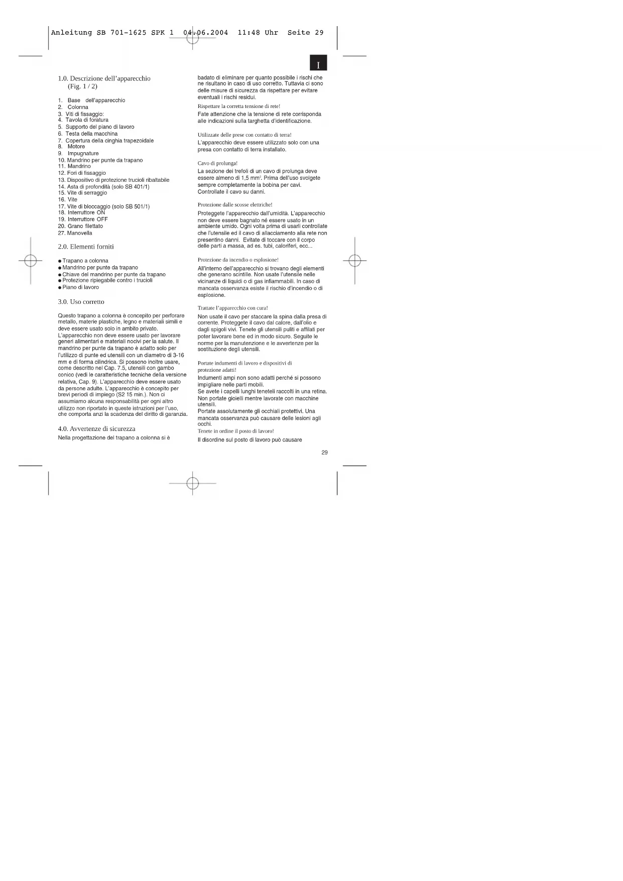 . Prima dell’uso svolgete sempre completamente la bobina per cavi. Controllate il cavo su danni. Protezione dalle scosse elettriche! Proteggete l’apparecchio dall’umidità. L’apparecchio non deve essere bagnato né essere usato in un ambiente umido. Ogni volta prima di usarli controllate che l’utensile ed il cavo di allacciamento alla rete non presentino danni. Evitate di toccare con il corpo delle parti a massa, ad es. tubi, caloriferi, ecc... Protezione da incendio o esplosione! All’interno dell’apparecchio si trovano degli elementi che generano scintille. Non usate l’utensile nelle vicinanze di liquidi o di gas infiammabili. In caso di mancata osservanza esiste il rischio d’incendio o di esplosione. Trattate l’apparecchio con cura! Non usate il cavo per staccare la spina dalla presa di corrente. Proteggete il cavo dal calore, dall’olio e dagli spigoli vivi. Tenete gli utensili puliti e affilati per poter lavorare bene ed in modo sicuro. Seguite le norme per la manutenzione e le avvertenze per la sostituzione degli utensili. Portate indumenti di lavoro e dispositivi di protezione adatti! Indumenti ampi non sono adatti perché si possono impigliare nelle parti mobili. Se avete i capelli lunghi teneteli raccolti in una retina. Non portate gioielli mentre lavorate con macchine utensili. Portate assolutamente gli occhiali protettivi. Una mancata osservanza può causare delle lesioni agli occhi. Tenete in ordine il posto di lavoro! Il disordine sul posto di lavoro può causare Anleitung SB 701-1625 SPK 1 04.06.2004 11:48 Uhr Seite 2930