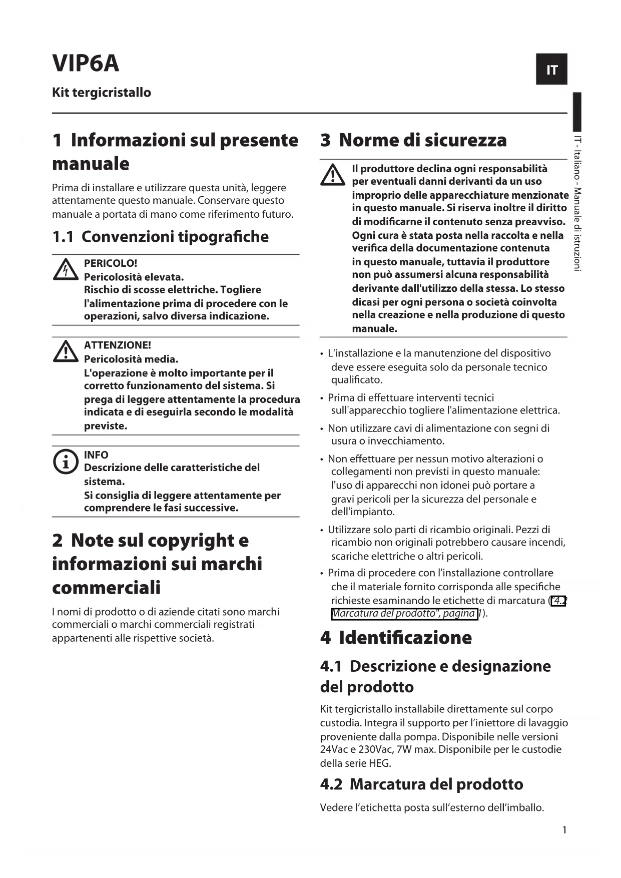 Il produttore declina ogni responsabilità per eventuali danni derivanti da un uso improprio delle apparecchiature menzionate in questo manuale. Si riserva inoltre il diritto di modificarne il contenuto senza preavviso. Ogni cura è stata posta nella raccolta e nella verifica della documentazione contenuta in questo manuale, tuttavia il produttore non può assumersi alcuna responsabilità derivante dall'utilizzo della stessa. Lo stesso dicasi per ogni persona o società coinvolta nella creazione e nella produzione di questo manuale.• L'installazione e la manutenzione del dispositivo deve essere eseguita solo da personale tecnico qualificato.• Prima di effettuare interventi tecnici sull'apparecchio togliere l'alimentazione elettrica.• Non utilizzare cavi di alimentazione con segni di usura o invecchiamento.• Non effettuare per nessun motivo alterazioni o collegamenti non previsti in questo manuale: l'uso di apparecchi non idonei può portare a gravi pericoli per la sicurezza del personale e dell'impianto.• Utilizzare solo parti di ricambio originali. Pezzi di ricambio non originali potrebbero causare incendi, scariche elettriche o altri pericoli.• Prima di procedere con l'installazione controllare che il materiale fornito corrisponda alle specifiche richieste esaminando le etichette di marcatura ("4.2 Marcatura del prodotto", pagina 1). 4 Identificazione