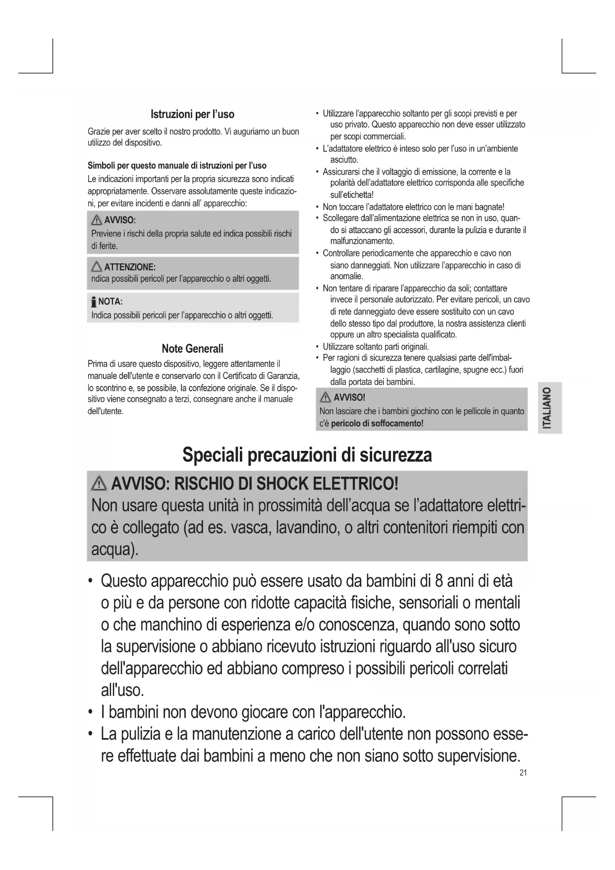 - Questo apparecchio può essere usato da bambini di 8 anni di età o più e da persone con ridotte capacità siche, sensoriali o mentali o che manchino di esperienza e/o conoscenza, quando sono sotto la supervisione o abbiano ricevuto istruzioni riguardo all'uso sicuro dell'apparecchio ed abbiano compreso i possibili pericoli correlati all'uso.