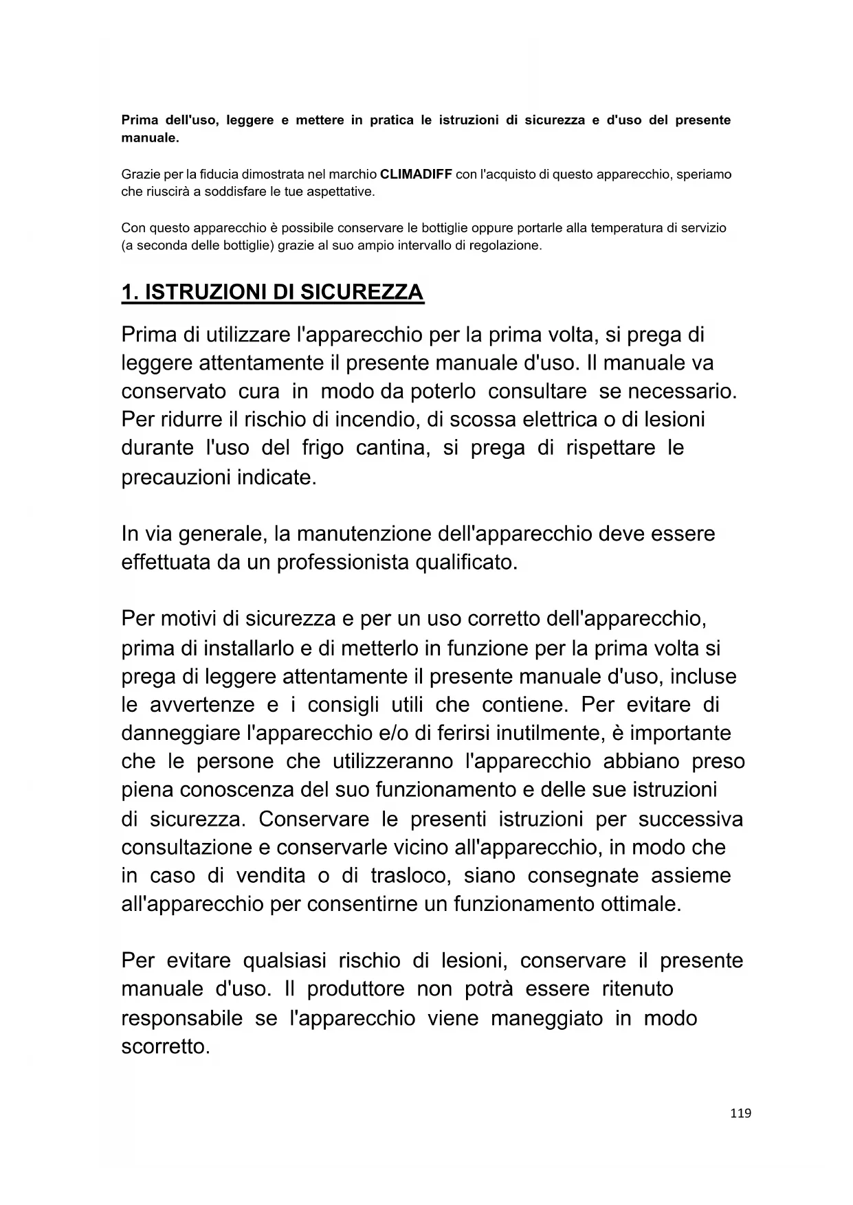 Prima di utilizzare l'apparecchio per la prima volta, si prega di leggere attentamente il presente manuale d'uso. Il manuale va conservato cura in modo da poterlo consultare se necessario. Per ridurre il rischio di incendio, di scossa elettrica o di lesioni durante l'uso del frigo cantina, si prega di rispettare le precauzioni indicate. In via generale, la manutenzione dell'apparecchio deve essere effettuata da un professionista qualificato. Per motivi di sicurezza e per un uso corretto dell'apparecchio, prima di installarlo e di metterlo in funzione per la prima volta si prega di leggere attentamente il presente manuale d'uso, incluse le avvertenze e i consigli utili che contiene. Per evitare di danneggiare l'apparecchio e/o di ferirsi inutilmente, è importante che le persone che utilizzeranno l'apparecchio abbiano preso piena conoscenza del suo funzionamento e delle sue istruzioni di sicurezza. Conservare le presenti istruzioni per successiva consultazione e conservarle vicino all'apparecchio, in modo che in caso di vendita o di trasloco, siano consegnate assieme all'apparecchio per consentirne un funzionamento ottimale. Per evitare qualsiasi rischio di lesioni, conservare il presente manuale d'uso. Il produttore non potrà essere ritenuto responsabile se l'apparecchio viene maneggiato in modo scorretto.120 Questo apparecchio è destinato esclusivamente ad uso domestico ed è previsto per la conservazione di bevande speciali ad una temperatura di conservazione più alta di quella di uno scomparto per prodotti freschi. In nessun caso questo apparecchio è destinato a conservare prodotti alimentari freschi. Verificare che la tensione dell'impianto elettrico della casa corrisponda a quella indicata sulla targa informativa: l'apparecchio deve essere collegato ad una presa di terra regolamentare. Riparazioni o collegamenti scorretti possono rappresentare un rischio per la sicurezza. Se si ha il minimo dubbio, far controllare il proprio impianto elettrico da un professionista. Per la tua protezione, questo apparecchio deve essere collegato correttamente ad una presa di terra. Non tagliare né togliere il filo di terra dal cavo di alimentazione fornito. Per motivi di sicurezza, non usare prolunghe. Se l'apparecchio si fosse rovinato (ad esempio per un forte urto) o danneggiato (sovratensione dovuta a fulmine, allagamento, incendio), può essere pericoloso utilizzarlo. Scollegare l'apparecchio dalla presa elettrica e farlo controllare da un riparatore professionista autorizzato. Per evitare pericoli, non sostituire da soli il cavo di alimentazione se rovinato. Contattare il proprio rivenditore, un centro assistenza autorizzato o un riparatore professionista. Questo apparecchio deve essere posizionato in modo che la presa a muro sia raggiungibile. Non spostare l'apparecchio una volta che è stato caricato con i vini perché la scocca potrebbe121 deformarsi, oltre a dover fare delle riparazioni. I componenti elettrici non devono essere a vista. ✓ Tenere i bambini lontano dall'apparecchio. ✓ Non usare l'apparecchio all'esterno. Se si fosse sparso accidentalmente del liquido (rottura di una bottiglia, ecc.) sui componenti elettrici (motore, ecc.), scollegare immediatamente l'apparecchio dalla presa elettrica. Per evitare il rischio di incendio, di scossa elettrica o di lesioni, non immergere il cavo di alimentazione, la spina o l'apparecchio stesso in acqua o in qualsiasi altro liquido. Non toccare l'apparecchio con le mani bagnate. Collocare l'apparecchio lontano da fonti di calore e non esporlo direttamente alla luce del sole. Non far pendere il cavo di alimentazione da un tavolo e non metterlo a contatto con angoli taglienti o superfici calde. Per scollegare l'apparecchio dalla corrente, non tirare il cavo di alimentazione ma afferrarlo dalla spina. Verificare che la zona dove verrà installato l'apparecchio sia in grado di sostenerne il peso una volta caricato (una bottiglia da 75 cl pesa circa 1,3 kg). Il frigo cantina deve essere collocato su una superficie piana. Se deve essere appoggiato su un tappeto o sulla moquette, infilare sotto un supporto. Per evitare di danneggiare la cerniera della porta, aprirla completamente quando si estraggono i ripiani.122 Sicurezza dei bambini e delle persone vulnerabili