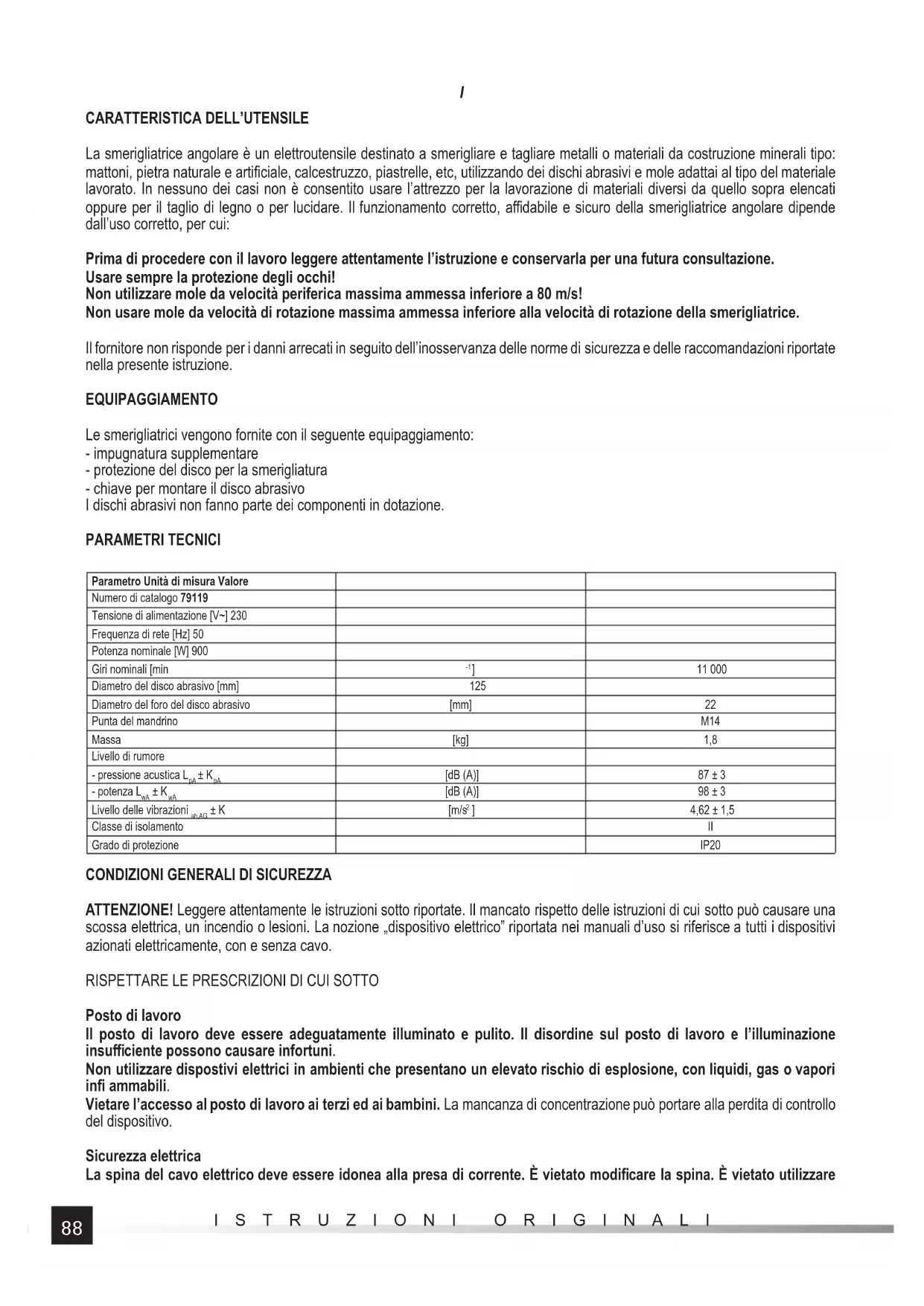 La smerigliatrice angolare è un elettroutensile destinato a smerigliare e tagliare metalli o materiali da costruzione minerali tipo: mattoni, pietra naturale e artifi ciale, calcestruzzo, piastrelle, etc, utilizzando dei dischi abrasivi e mole adattai al tipo del materiale lavorato. In nessuno dei casi non è consentito usare l’attrezzo per la lavorazione di materiali diversi da quello sopra elencati oppure per il taglio di legno o per lucidare. Il funzionamento corretto, affi dabile e sicuro della smerigliatrice angolare dipende dall’uso corretto, per cui: Prima di procedere con il lavoro leggere attentamente l’istruzione e conservarla per una futura consultazione. Usare sempre la protezione degli occhi! Non utilizzare mole da velocità periferica massima ammessa inferiore a 80 m/s! Non usare mole da velocità di rotazione massima ammessa inferiore alla velocità di rotazione della smerigliatrice. Il fornitore non risponde per i danni arrecati in seguito dell’inosservanza delle norme di sicurezza e delle raccomandazioni riportate nella presente istruzione. EQUIPAGGIAMENTO Le smerigliatrici vengono fornite con il seguente equipaggiamento: - impugnatura supplementare - protezione del disco per la smerigliatura - chiave per montare il disco abrasivo I dischi abrasivi non fanno parte dei componenti in dotazione. PARAMETRI TECNICI Parametro Unità di misura Valore Numero di catalogo 79119 Tensione di alimentazione [V~] 230 Frequenza di rete [Hz] 50 Potenza nominale [W] 900 Giri nominali [min