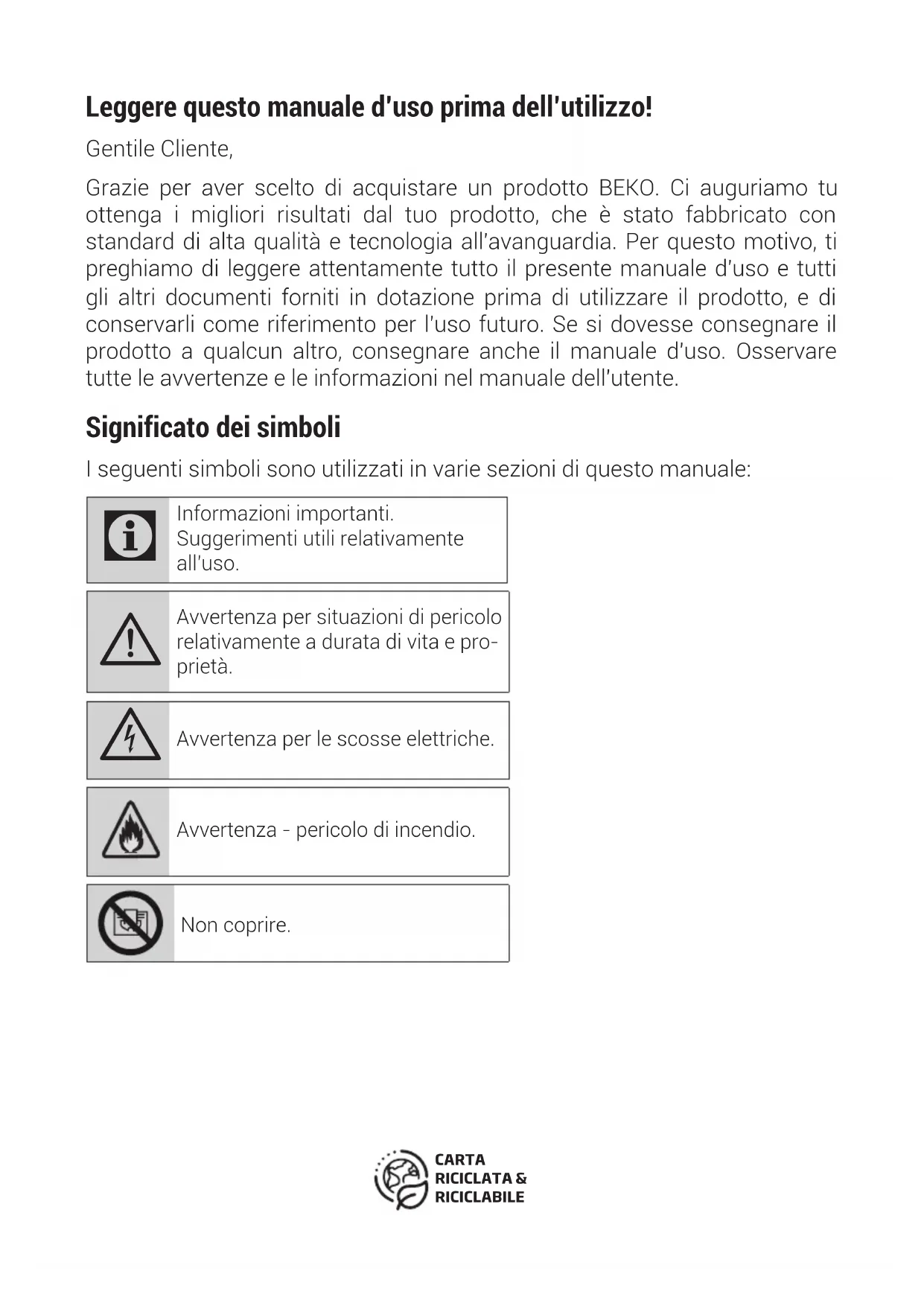 . BEKO declina ogni responsabilità per eventuali danni che possano derivare, direttamente od indirettamente, a persone e cose come conseguenza del mancato rispetto da parte dell’utente delle istruzioni incluse nell’apposito manuale allegato a ciascun prodotto ed in particolar modo delle istruzioni relative alla installazione, all’uso ed alla manutenzione del prodotto stesso.