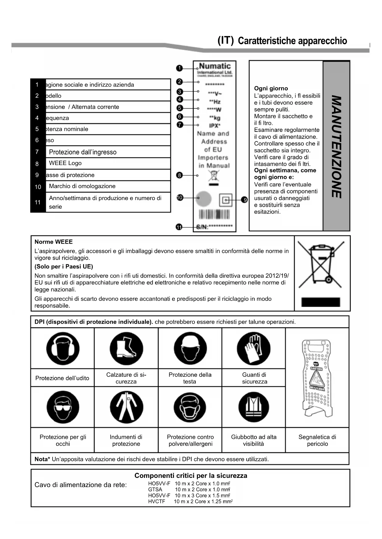 - Esaminare periodicamente il cavo di alimentazione; in caso di danni, sostituirlo con uno speciale cavo disponibile presso Numatic o il relativo servizio di assistenza.