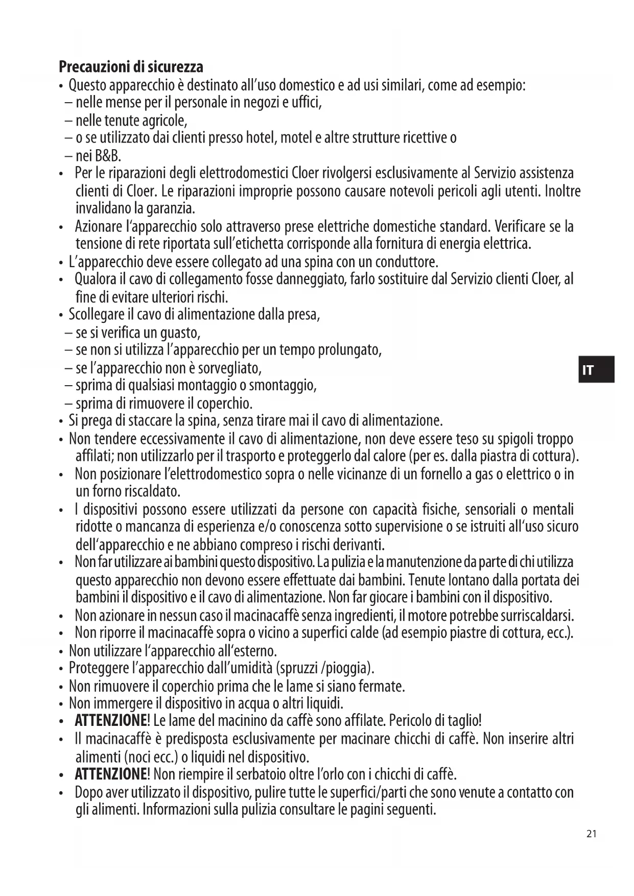 - ATTENZIONE! Le lame del macinino da caffè sono affilate. Pericolo di taglio!