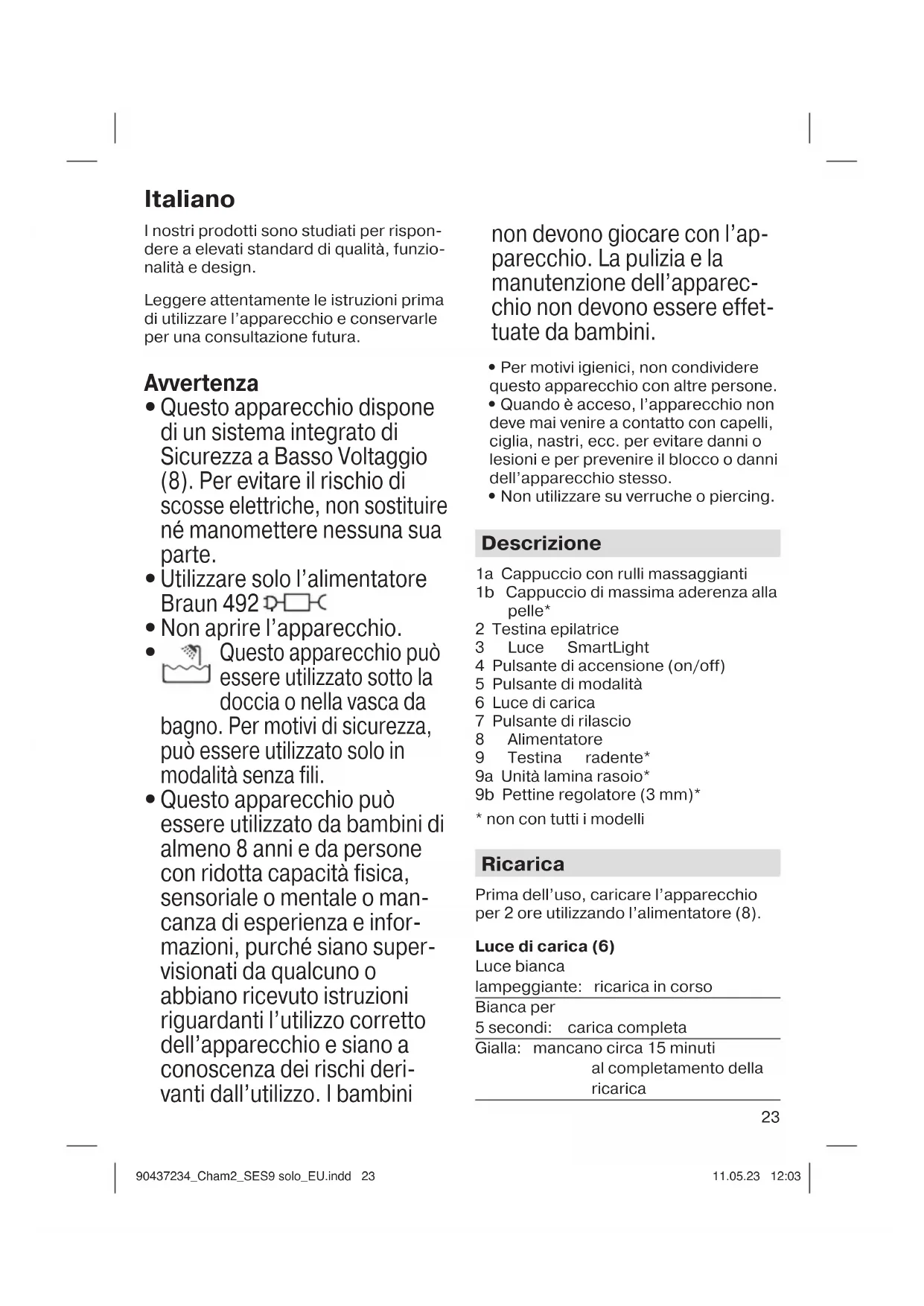 - L’esfoliazione previene i peli incarniti e prepara la pelle all’epilazione. Come epilarsi Assicurarsi che la testina epilatrice (2) sia pulita. A seconda del modello, applicare uno dei cappucci: Cappuccio con rulli massaggianti (1a): per il massimo comfort 90437234_Cham2_SES9 solo_EU.indd 2490437234_Cham2_SES9 solo_EU.indd 24 11.05.23 12:0311.05.23 12:0325 Cappuccio di massima aderenza alla pelle (1b): per una maggiore effi- cienza Utilizzo a secco: La pelle deve essere asciutta e priva di unguenti o creme. Utilizzo sotto l’acqua: Assicurarsi che la pelle sia ben bagnata per ottenere con- dizioni di scorrimento ottimali. Tenere sempre la pelle ben tesa durante l’epilazione. Guidare l’apparecchio con movimenti lenti e continui senza eserci- tare pressione, in senso opposto rispetto ai peli, in direzione della luce. Gambe: per epilare la zona dietro il ginocchio, tenere la gamba ben tesa in avanti. Aree sensibili: per prima cosa, è necessario pulire a fondo e asciugare con cura le aree sensi- bili per rimuovere eventuali residui (come il deodorante). Durante l’epilazione delle ascelle, sollevare il braccio per tendere la pelle e guidare l’apparecchio in direzioni diverse. Dopo l’epilazione, la pelle può essere più sensibile. È bene evitare l’uti- lizzo di sostanze irritanti come deodo- ranti a base di alcol. Pulizia della testina epilatrice Dopo l’uso, spegnere l’apparecchio e pulire la testina epilatrice: Rimuovere il cappuccio (1a/b). Spazzo- lare le pinzette ruotando manualmente l’unità. Premere il pulsante di rilascio (7) per rimuovere la testina epilatrice. Pic- chiettalo delicatamente per rimuovere i peli dall'interno. Qualora fosse necessaria una pulizia profonda, tenere la testina epilatrice dell’apparecchio sotto l’acqua corrente calda. Rimuovere quindi la testina epila- trice e scuoterla per eliminare l’acqua in eccesso. Assicurarsi che sia asciutta prima di riposizionarla. Informazioni generali sull’epilazione Tutti i metodi di rimozione dei peli alla radice possono provocare irritazioni (ad es. prurito, sensazioni fastidiose e arros- samento della pelle), a seconda delle condizioni della pelle e della tipologia di peli. Si tratta di una reazione normale che dovrebbe scomparire velocemente, ma che può essere più evidente se si rimuo- vono i peli alla radice per la prima volta o in caso di pelle sensibile. In generale, la sensazione di fastidio e le reazioni cutanee tendono a diminuire considerevolmente con l’uso regolare. Se la pelle dovesse mostrare ancora tracce di irritazione dopo 36 ore dall’epi- lazione, si consiglia di consultare il medico. Per ridurre al minimo il rischio di infezioni o di infiammazioni dovute a batteri che penetrano nella pelle in caso di micro-le- sioni, pulire accuratamente la testina epi- latrice e detergere la pelle prima di ogni utilizzo. In caso di dubbi in merito all’utilizzo dell’apparecchio, consultare il medico. L’apparecchio dovrà essere utilizzato solo dopo aver consultato un medico nei seguenti casi: eczema, ferite, reazioni infiammatorie della pelle come follicolite (forma di infezione dei follicoli capillari) e vene varicose, attorno ai nei, immunità cutanea ridotta, ad es. a seguito di dia- bete mellito, durante la gravidanza, in caso di malattia di Raynaud, emofilia, candida o immunodeficienza. Rasatura (B) La testina radente (9) è progettata per ottenere una rasatura veloce e accurata delle gambe, delle ascelle e della zona bikini. Radere sulla pelle asciutta per ottenere risultati migliori. Per regolare i peli fino a 3 mm di lunghez- za, posizionare il pettine regolatore (9b) e guidarlo in modo che aderisca alla pelle, con l’apertura in direzione contraria ai peli. 90437234_Cham2_SES9 solo_EU.indd 2590437234_Cham2_SES9 solo_EU.indd 25 11.05.23 12:0311.05.23 12:0326 Pulizia Non pulire la lamina della testina radente con la spazzolina per non danneggiarla. Rimuovere l'unità lamina rasoio (9a) come mostrato a pagina 5. Picchiettarla su una superficie piana. Pulire la testina del rasoio con la spazzolina o sotto l'ac- qua corrente. Rimontare una volta asciutto. Lubrificare regolarmente (1. lamina/2. rifinitori). INFORMAZIONE AGLI UTILIZZATORI Il simbolo del cassonetto barrato riportato sull’apparecchiatura o sulla sua confezione indica che il prodotto alla fine della propria vita utile deve essere raccolto separatamente dagli altri rifiuti. L’utente dovrà, pertanto, conferire l’apparecchiatura giunta a fine vita agli idonei centri comunali di raccolta differenziata dei rifiuti elettrotecnici ed elettronici. In alternativa alla gestione autonoma è possibile consegnare l’ap- parecchiatura che si desidera smaltire al rivenditore, al momento dell’acquisto di una nuova apparecchiatura di tipo equi- valente. Presso i rivenditori di prodotti elettronici con superficie di vendita di almeno 400 m