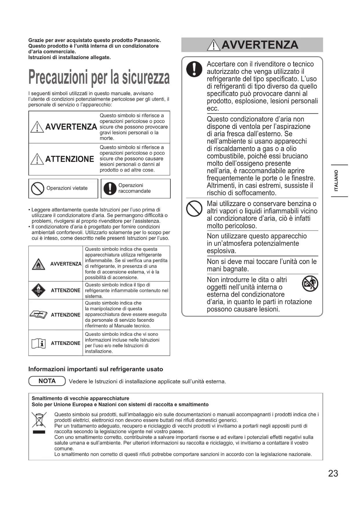 Innenteile der Außeneinheit, unter anderem die Schlange, müssen regelmäßig gereinigt werden.• Wenden Sie sich bitte an Ihren Händler oder Kundendienst. LuftauslassLufteinlassMit einem weichen Tuch abwischen.(Bei starker Verschmutzung ein mit lauwarmem Wasser angefeuchtetes Tuch verwenden.) 00_340581_all.indb 22 2022/5/12 10:14:0323 ITALIANOGrazie per aver acquistato questo prodotto Panasonic.Questo prodotto è l’unità interna di un condizionatore d’aria commerciale.Istruzioni di installazione allegate. Accertare con il rivenditore o tecnico autorizzato che venga utilizzato il refrigerante del tipo specicato. L’uso di refrigeranti di tipo diverso da quello specicato può provocare danni al prodotto, esplosione, lesioni personali ecc. Questo condizionatore d’aria non dispone di ventola per l’aspirazione di aria fresca dall’esterno. Se nell’ambiente si usano apparecchi di riscaldamento a gas o a olio combustibile, poiché essi bruciano molto dell’ossigeno presente nell’aria, è raccomandabile aprire frequentemente le porte o le nestre. Altrimenti, in casi estremi, sussiste il rischio di soffocamento. Mai utilizzare o conservare benzina o altri vapori o liquidi inammabili vicino al condizionatore d’aria, ciò è infatti molto pericoloso. Non utilizzare questo apparecchio in un’atmosfera potenzialmente esplosiva. Non si deve mai toccare l’unità con le mani bagnate. Non introdurre le dita o altri oggetti nell’unità interna o esterna del condizionatore d’aria, in quanto le parti in rotazione possono causare lesioni. AVVERTENZA Precauzioni per la sicurezza I seguenti simboli utilizzati in questo manuale, avvisano l’utente di condizioni potenzialmente pericolose per gli utenti, il personale di servizio o l’apparecchio: AVVERTENZA Questo simbolo si riferisce a operazioni pericolose o poco sicure che possono provocare gravi lesioni personali o la morte. ATTENZIONE Questo simbolo si riferisce a operazioni pericolose o poco sicure che possono causare lesioni personali o danni al prodotto o ad altre cose.Operazioni vietateOperazioni raccomandate• Leggere attentamente queste Istruzioni per l’uso prima di utilizzare il condizionatore d’aria. Se permangono difcoltà o problemi, rivolgersi al proprio rivenditore per l’assistenza.• Il condizionatore d’aria è progettato per fornire condizioni ambientali confortevoli. Utilizzarlo solamente per lo scopo per cui è inteso, come descritto nelle presenti Istruzioni per l’uso.AVVERTENZAQuesto simbolo indica che questa apparecchiatura utilizza refrigerante infiammabile. Se si verifica una perdita di refrigerante, in presenza di una fonte di accensione esterna, vi è la possibilità di accensione.ATTENZIONEQuesto simbolo indica il tipo di refrigerante infiammabile contenuto nel sistema.ATTENZIONEQuesto simbolo indica che la manipolazione di questa apparecchiatura deve essere eseguita da personale di servizio facendo riferimento al Manuale tecnico.ATTENZIONEQuesto simbolo indica che vi sono informazioni incluse nelle Istruzioni per l’uso e/o nelle Istruzioni di installazione.Informazioni importanti sul refrigerante usato NOTA Vedere le Istruzioni di installazione applicate sull’unità esterna.Smaltimento di vecchie apparecchiatureSolo per Unione Europea e Nazioni con sistemi di raccolta e smaltimento Questo simbolo sui prodotti, sull’imballaggio e/o sulle documentazioni o manuali accompagnanti i prodotti indica che i prodotti elettrici, elettronici non devono essere buttati nei riuti domestici generici.Per un trattamento adeguato, recupero e riciclaggio di vecchi prodotti vi invitiamo a portarli negli appositi punti di raccolta secondo la legislazione vigente nel vostro paese. Con uno smaltimento corretto, contribuirete a salvare importanti risorse e ad evitare i potenziali effetti negativi sulla salute umana e sull’ambiente. Per ulteriori informazioni su raccolta e riciclaggio, vi invitiamo a contattare il vostro comune. Lo smaltimento non corretto di questi riuti potrebbe comportare sanzioni in accordo con la legislazione nazionale. 00_340581_all.indb 23 2022/5/12 10:14:0424 Se il refrigerante entra in contatto con una amma, produce gas tossici. Per motivi di sicurezza, prima di procedere con la pulizia o la manutenzione, spegnere il condizionatore d’aria e scollegarlo dall’alimentazione elettrica. Scollegare la spia di alimentazione dalla presa, oppure spegnere l’interruttore differenziale o disinserire l’alimentazione spegnendo il sezionatore, in modo da isolare il condizionatore d’aria dall’alimentazione di rete in caso di emergenza. Smaltire in conformità con le normative nazionali e/o locali. Questo prodotto non deve essere modicato o smontato in nessun caso. L’unità modicata o smontata può causare incendio, scosse elettriche o lesioni personali. Non pulire da sé l’interno delle unità interne ed esterne. Tale pulizia deve essere afdata a un rivenditore o a un tecnico autorizzato. In caso di malfunzionamento dell’apparecchio, non tentare di ripararlo da sé. Per le riparazioni e lo smaltimento, rivolgersi al proprio rivenditore o a un centro di assistenza. Collegare ciascuna unità a una presa di corrente dedicata e nella linea esclusiva installare un sezionatore, un interruttore differenziale contro le perdite a terra (ELCB) o un interruttore differenziale (RCD) per la protezione da sovracorrente. Collegare ciascuna unità a una presa elettrica dedicata e con i cablaggi ssi provvisti della possibilità di scollegare totalmente l’alimentazione mediante separazione di tutti i poli in ottemperanza alle normative sui collegamenti elettrici. Per evitare i rischi derivanti da eventuali problemi di isolamento, l’unità deve essere collegata a massa. AVVERTENZA Per prevenire surriscaldamento e incendio, non utilizzare cavi modicati, cavi di giunzione, prolunghe o cavi non specicati. L’apparecchio deve essere conservato in un locale in cui non siano presenti fonti di accensio
