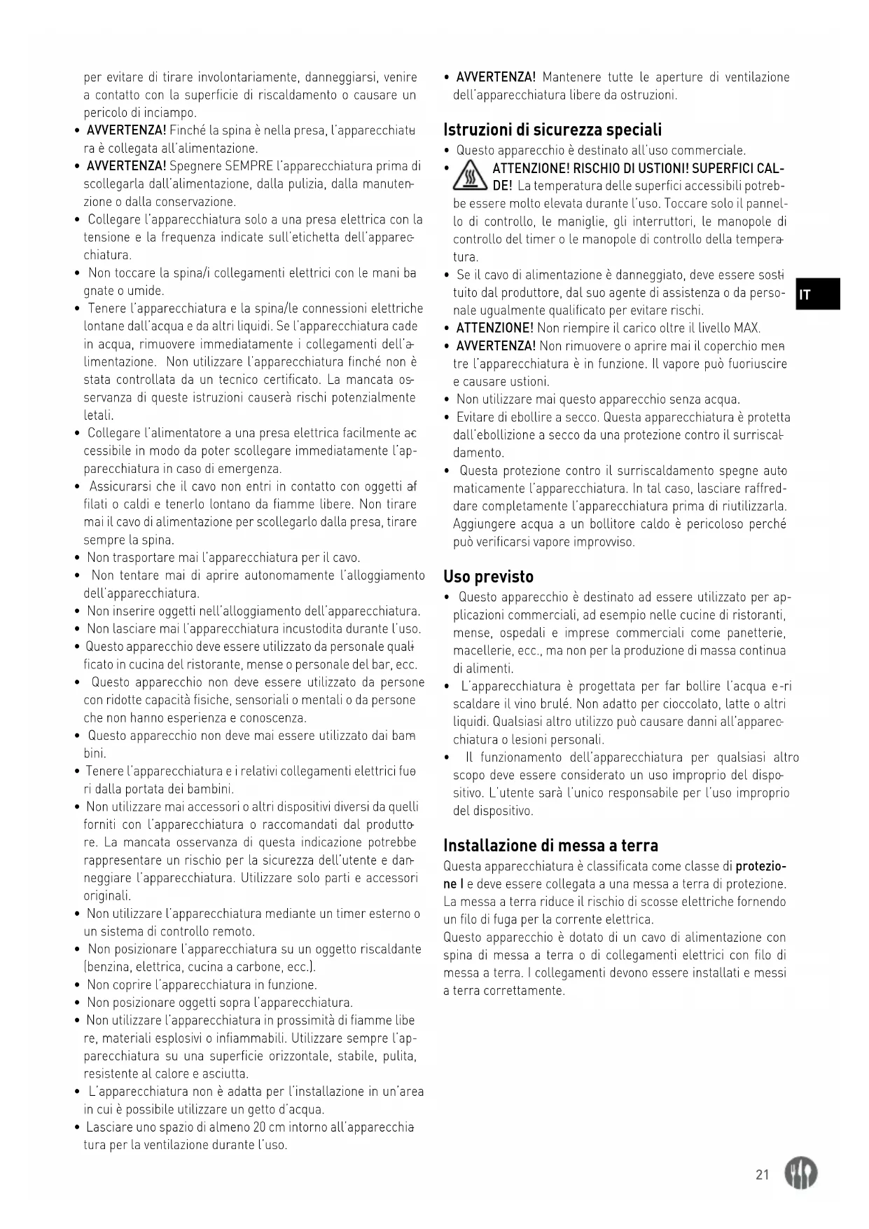 - Evitare di ebollire a secco. Questa apparecchiatura è protetta dall’ebollizione a secco da una protezione contro il surriscal