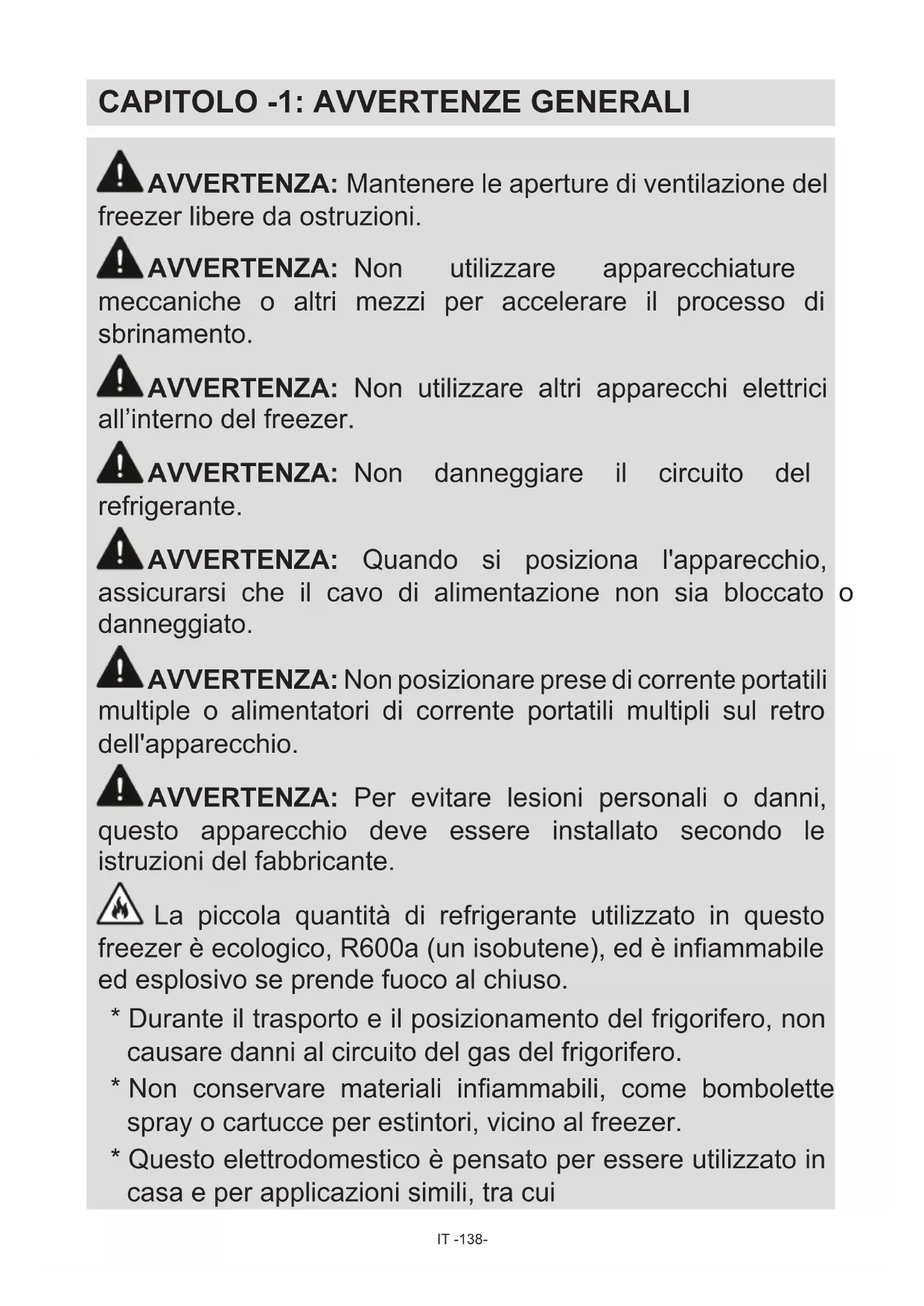 AVVERTENZA: Mantenere le aperture di ventilazione del freezer libere da ostruzioni. AVVERTENZA: Non utilizzare apparecchiature meccaniche o altri mezzi per accelerare il processo di sbrinamento. AVVERTENZA: Non utilizzare altri apparecchi elettrici all’interno del freezer. AVVERTENZA: Non danneggiare il circuito del refrigerante. AVVERTENZA: Quando si posiziona l'apparecchio, assicurarsi che il cavo di alimentazione non sia bloccato o danneggiato. AVVERTENZA: Non posizionare prese di corrente portatili multiple o alimentatori di corrente portatili multipli sul retro dell'apparecchio. AVVERTENZA: Per evitare lesioni personali o danni, questo apparecchio deve essere installato secondo le istruzioni del fabbricante. La piccola quantità di refrigerante utilizzato in questo freezer è ecologico, R600a (un isobutene), ed è inammabile ed esplosivo se prende fuoco al chiuso.