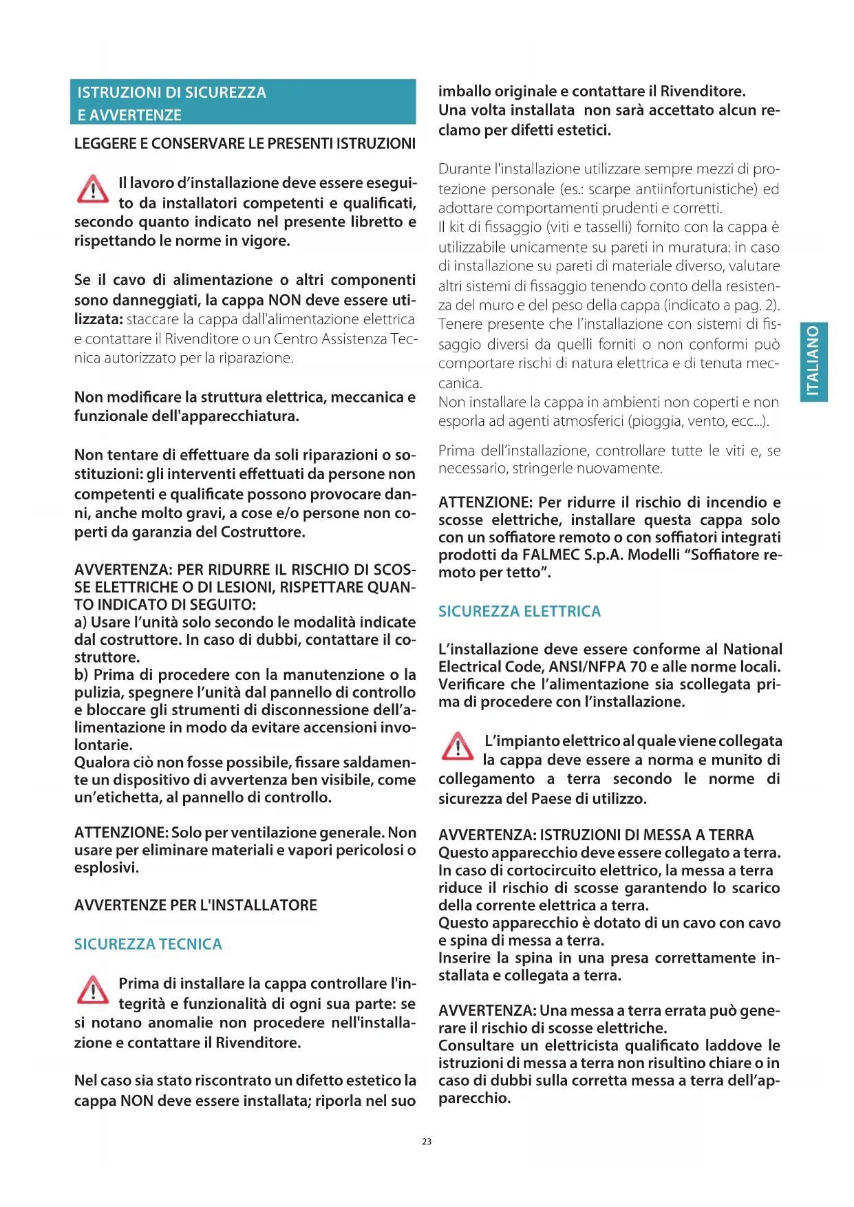 SICUREZZA TECNICA Prima di installare la cappa controllare l'in- tegrità e funzionalità di ogni sua parte: se si notano anomalie non procedere nell'installa- zione e contattare il Rivenditore. Nel caso sia stato riscontrato un difetto estetico la cappa NON deve essere installata; riporla nel suo imballo originale e contattare il Rivenditore. Una volta installata non sarà accettato alcun re- clamo per difetti estetici. Durante l'installazione utilizzare sempre mezzi di pro- tezione personale (es.: scarpe antiinfortunistiche) ed adottare comportamenti prudenti e corretti. Il kit di fissaggio (viti e tasselli) fornito con la cappa è utilizzabile unicamente su pareti in muratura: in caso di installazione su pareti di materiale diverso, valutare altri sistemi di fissaggio tenendo conto della resisten- za del muro e del peso della cappa (indicato a pag. 2). Tenere presente che l’installazione con sistemi di fis- saggio diversi da quelli forniti o non conformi può comportare rischi di natura elettrica e di tenuta mec- canica. Non installare la cappa in ambienti non coperti e non esporla ad agenti atmosferici (pioggia, vento, ecc...). Prima dell’installazione, controllare tutte le viti e, se necessario, stringerle nuovamente. ATTENZIONE: Per ridurre il rischio di incendio e scosse elettriche, installare questa cappa solo con un soatore remoto o con soatori integrati prodotti da FALMEC S.p.A. Modelli “Soatore re- moto per tetto”. SICUREZZA ELETTRICA L’installazione deve essere conforme al National Electrical Code, ANSI/NFPA 70 e alle norme locali. Vericare che l’alimentazione sia scollegata pri- ma di procedere con l’installazione. L’impianto elettrico al quale viene collegata la cappa deve essere a norma e munito di collegamento a terra secondo le norme di sicurezza del Paese di utilizzo.