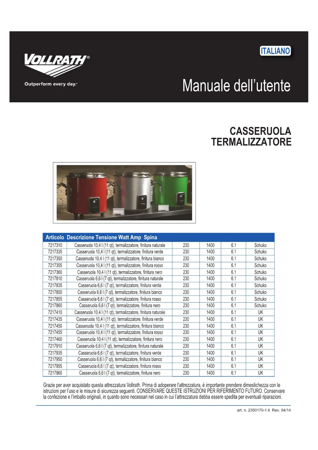 Scarica le istruzioni per il tuo Fornello elettrico in formato PDF gratuitamente! Trova il tuo manuale 7217335 - Vollrath e riprendi in mano il tuo dispositivo elettronico. In questa pagina sono pubblicati tutti i documenti necessari per l'utilizzo del tuo dispositivo. 7217335 del marchio Vollrath.
