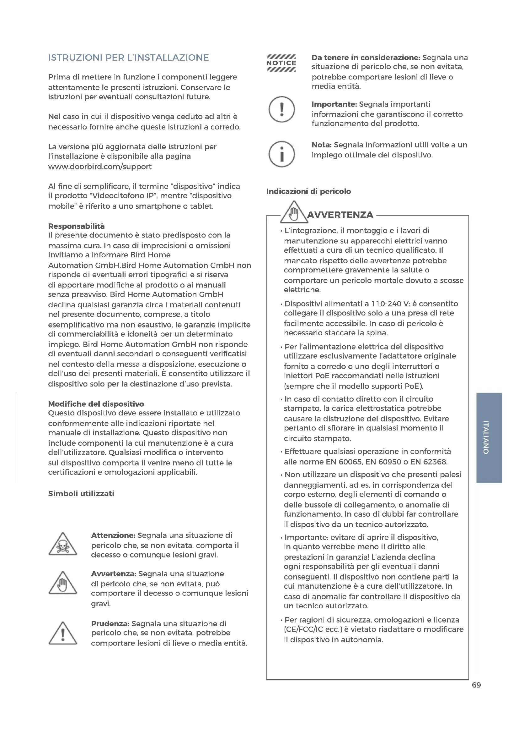Prima di mettere in funzione i componenti leggere attentamente le presenti istruzioni. Conservare le istruzioni per eventuali consultazioni future. Nel caso in cui il dispositivo venga ceduto ad altri è necessario fornire anche queste istruzioni a corredo. La versione più aggiornata delle istruzioni per l’installazione è disponibile alla pagina www.doorbird.com/support Al fine di semplificare, il termine “dispositivo” indica il prodotto “Videocitofono IP”, mentre “dispositivo mobile” è riferito a uno smartphone o tablet. Responsabilità Il presente documento è stato predisposto con la massima cura. In caso di imprecisioni o omissioni invitiamo a informare Bird Home Automation GmbH.Bird Home Automation GmbH non risponde di eventuali errori tipografici e si riserva di apportare modifiche al prodotto o ai manuali senza preavviso. Bird Home Automation GmbH declina qualsiasi garanzia circa i materiali contenuti nel presente documento, comprese, a titolo esemplificativo ma non esaustivo, le garanzie implicite di commerciabilità e idoneità per un determinato impiego. Bird Home Automation GmbH non risponde di eventuali danni secondari o conseguenti verificatisi nel contesto della messa a disposizione, esecuzione o dell’uso dei presenti materiali. È consentito utilizzare il dispositivo solo per la destinazione d’uso prevista. Modifiche del dispositivo Questo dispositivo deve essere installato e utilizzato conformemente alle indicazioni riportate nel manuale di installazione. Questo dispositivo non include componenti la cui manutenzione è a cura dell’utilizzatore. Qualsiasi modifica o intervento sul dispositivo comporta il venire meno di tutte le certificazioni e omologazioni applicabili. Simboli utilizzati Attenzione: Segnala una situazione di pericolo che, se non evitata, comporta il decesso o comunque lesioni gravi. Avvertenza: Segnala una situazione di pericolo che, se non evitata, può comportare il decesso o comunque lesioni gravi. Da tenere in considerazione: Segnala una situazione di pericolo che, se non evitata, potrebbe comportare lesioni di lieve o media entità. Nota: Segnala informazioni utili volte a un impiego ottimale del dispositivo. Importante: Segnala importanti informazioni che garantiscono il corretto funzionamento del prodotto. Prudenza: Segnala una situazione di pericolo che, se non evitata, potrebbe comportare lesioni di lieve o media entità. Indicazioni di pericolo