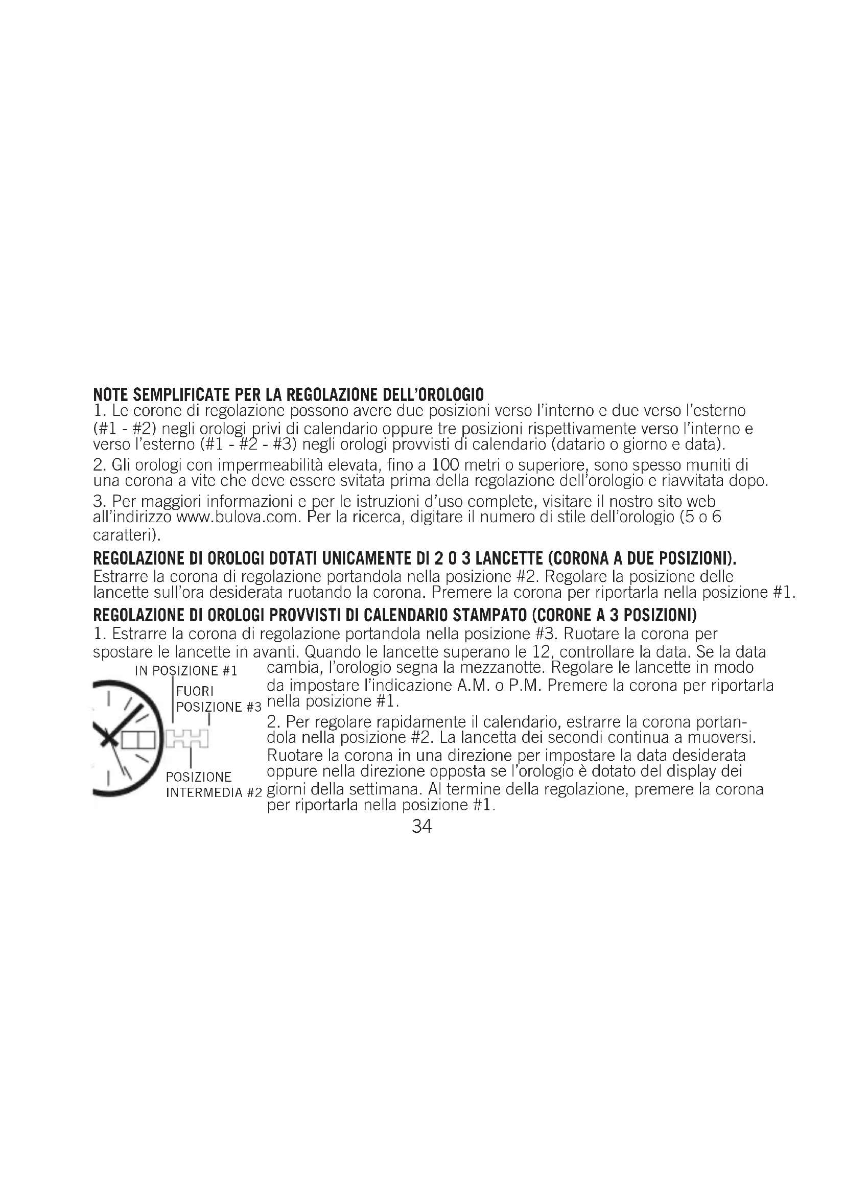 all’indirizzo www.bulova.com. Per la ricerca, digitare il numero di stile dell’orologio (5 o 6 caratteri). REGOLAZIONE DI OROLOGI DOTATI UNICAMENTE DI 2 O 3 LANCETTE (CORONA A DUE POSIZIONI). Estrarre la corona di regolazione portandola nella posizione #2. Regolare la posizione delle lancette sull’ora desiderata ruotando la corona. Premere la corona per riportarla nella posizione #1. REGOLAZIONE DI OROLOGI PROVVISTI DI CALENDARIO STAMPATO (CORONE A 3 POSIZIONI)