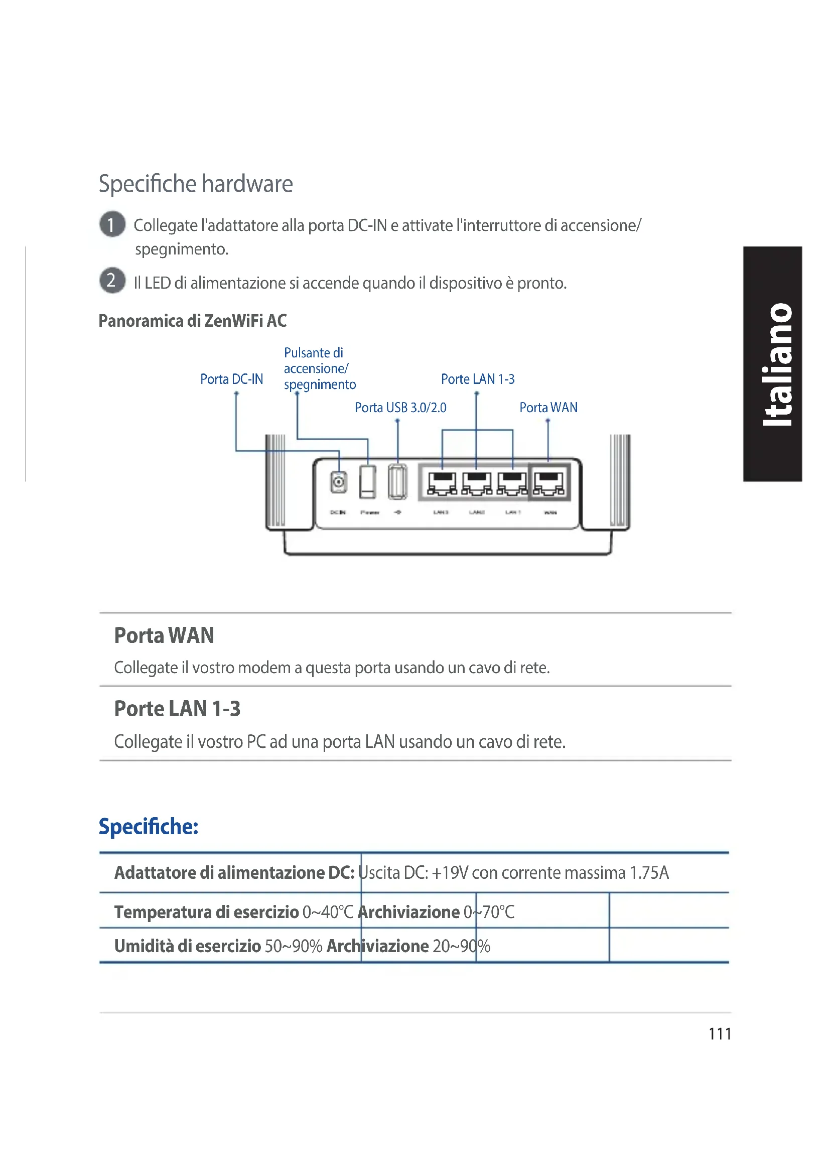 Collegate l'adattatore alla porta DC-IN e attivate l'interruttore di accensione/spegnimento. Il LED di alimentazione si accende quando il dispositivo è pronto. Speciche hardware Porta WAN Collegate il vostro modem a questa porta usando un cavo di rete. Porte LAN 1-3 Collegate il vostro PC ad una porta LAN usando un cavo di rete. Adattatore di alimentazione DC: Uscita DC: +19V con corrente massima 1.75ATemperatura di esercizio 0~40°C Archiviazione 0~70°CUmidità di esercizio 50~90% Archiviazione 20~90% Speciche: Panoramica di ZenWiFi ACPulsante di accensione/spegnimentoPorta DC-INPorta WANPorte LAN 1-3Porta USB 3.0/2.0112 Italiano Prima dell'installazione Installazione come router singolo
