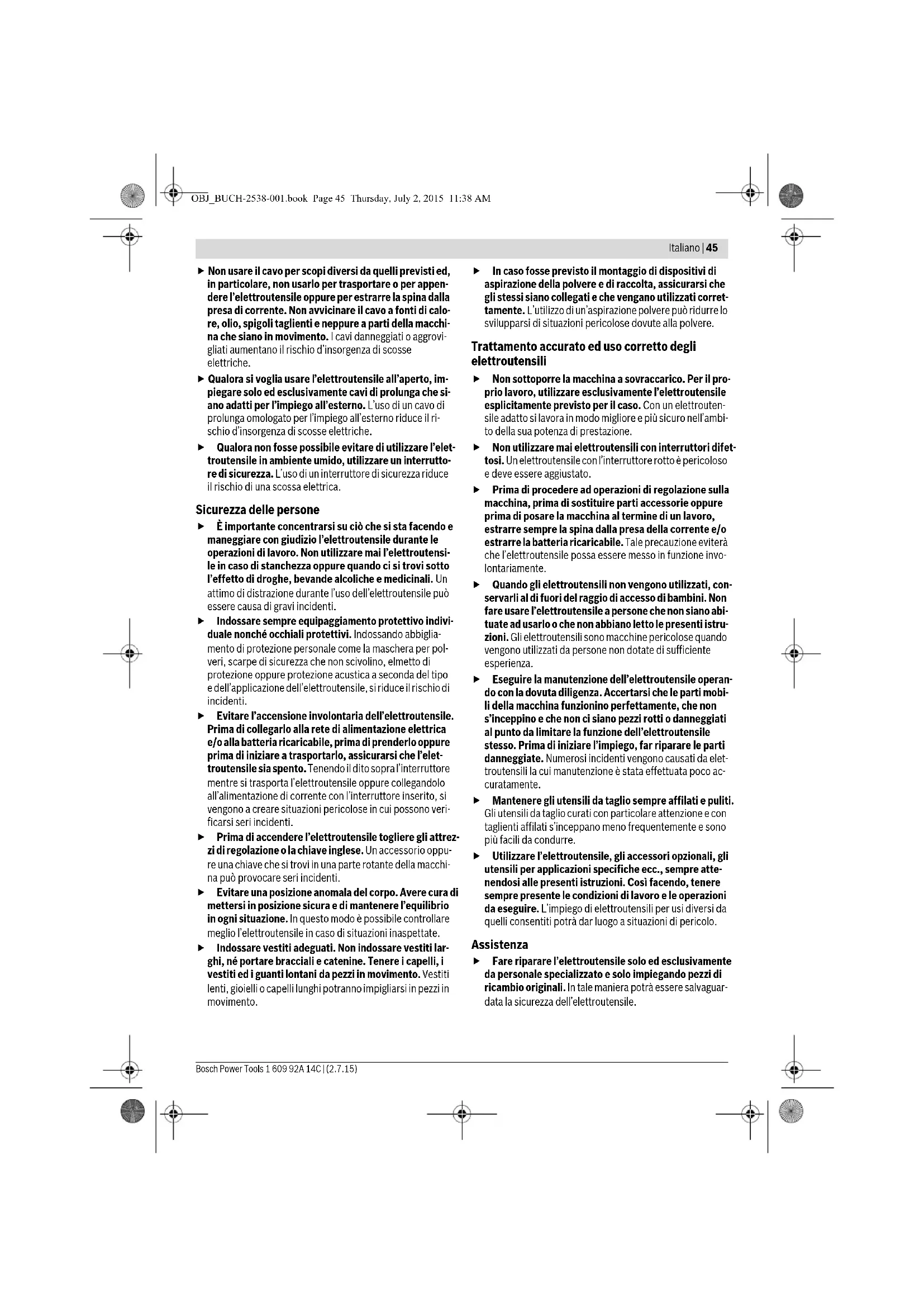 Seleccionar acessórios – 283 – 285 Meta de ação Figura Observe Página OBJ_BUCH-2538-001.book Page 43 Thursday, July 2, 2015 11:38 AM44 | Italiano 1 609 92A 14C | (2.7.15) Bosch Power Tools Manutenção e limpeza Manter a ferramenta eléctrica e as aberturas de venti- lação sempre limpas, para trabalhar bem e de forma se- gura. Em condições de trabalho extremas deverá, se possível, usar sempre um equipamento de aspiração. Soprar fre- quentemente as aberturas de ventilação e interconectar um disjuntor de corrente de avaria (PRCD). Durante o pro- cessamento de metais é possível que se deposite pó conduti- vo no interior da ferramenta eléctrica. Isto pode prejudicar o isolamento de protecção da ferramenta eléctrica. Os acessórios devem ser armazenados e tratados com cuida- do. Se for necessário substituir o cabo de conexão, isto deverá ser realizado pela Bosch ou por uma oficina de serviço pós- venda autorizada para todas as ferramentas eléctricas Bosch para evitar riscos de segurança. Serviço pós-venda e consultoria de aplicação O serviço pós-venda responde às suas perguntas a respeito de serviços de reparação e de manutenção do seu produto, assim como das peças sobressalentes. Desenhos explodidos e informações sobre peças sobressalentes encontram-se em: www.bosch-pt.com A nossa equipa de consultoria de aplicação Bosch esclarecem com prazer todas as suas dúvidas a respeito da compra, apli- cação e ajuste dos produtos e acessórios. Indique para todas as questões e encomendas de peças so- bressalentes a referência de 10 dígitos de acordo com a placa de características do produto. Portugal Robert Bosch LDA Avenida Infante D. Henrique Lotes 2E – 3E 1800 Lisboa Para efectuar o seu pedido online de peças entre na página www.ferramentasbosch.com. Tel.: 21 8500000 Fax: 21 8511096 Brasil Robert Bosch Ltda. Caixa postal 1195 13065-900 Campinas Tel.: (0800) 7045446 www.bosch.com.br/contacto Eliminação Ferramentas eléctricas, acessórios e embalagens devem ser enviados a uma reciclagem ecológica de matérias primas. Não deitar ferramentas eléctricas no lixo doméstico! Apenas países da União Europeia: De acordo com a directiva europeia 2012/19/UE para aparelhos eléctricos e electrónicos velhos, e com as respectivas realizações nas leis nacionais, as ferramen- tas eléctricas que não servem mais para a utilização, devem ser enviadas separada- mente a uma reciclagem ecológica. Sob reserva de alterações. Italiano Avvertenze generali di pericolo per elettroutensili Leggere tutte le avvertenze di peri- colo e le istruzioni operative. In caso di mancato rispetto delle avvertenze di pericolo e delle istruzioni operative si potrà creare il pericolo di scosse elettri- che, incendi e/o incidenti gravi. Conservare tutte le avvertenze di pericolo e le istruzioni operative per ogni esigenza futura. Il termine «elettroutensile» utilizzato nelle avvertenze di peri- colo si riferisce ad utensili elettrici alimentati dalla rete (con li- nea di allacciamento) ed ad utensili elettrici alimentati a bat- teria (senza linea di allacciamento). Sicurezza della postazione di lavoro Tenere la postazione di lavoro sempre pulita e ben illu- minata. Il disordine oppure zone della postazione di lavoro non illuminate possono essere causa di incidenti. Evitare d’impiegare l’elettroutensile in ambienti sog- getti al rischio di esplosioni nei quali si abbia presenza di liquidi, gas o polveri infiammabili. Gli elettroutensili producono scintille che possono far infiammare la polvere o i gas. Tenere lontani i bambini ed altre persone durante l’im- piego dell’elettroutensile. Eventuali distrazioni potranno comportare la perdita del controllo sull’elettroutensile. Sicurezza elettrica La spina di allacciamento alla rete dell’elettroutensile deve essere adatta alla presa. Evitare assolutamente di apportare modifiche alla spina. Non impiegare spine adattatrici assieme ad elettroutensili dotati di collega- mento a terra. Le spine non modificate e le prese adatte allo scopo riducono il rischio di scosse elettriche. Evitare il contatto fisico con superfici collegate a terra, come tubi, riscaldamenti, cucine elettriche e frigorife- ri. Sussiste un maggior rischio di scosse elettriche nel mo- mento in cui il corpo è messo a massa. Custodire l’elettroutensile al riparo dalla pioggia o dall’umidità. La penetrazione dell’acqua in un elettrouten- sile aumenta il rischio di una scossa elettrica. AVVERTENZA OBJ_BUCH-2538-001.book Page 44 Thursday, July 2, 2015 11:38 AMItaliano | 45 Bosch Power Tools 1 609 92A 14C | (2.7.15) Non usare il cavo per scopi diversi da quelli previsti ed, in particolare, non usarlo per trasportare o per appen- dere l’elettroutensile oppure per estrarre la spina dalla presa di corrente. Non avvicinare il cavo a fonti di calo- re, olio, spigoli taglienti e neppure a parti della macchi- na che siano in movimento. I cavi danneggiati o aggrovi- gliati aumentano il rischio d’insorgenza di scosse elettriche. Qualora si voglia usare l’elettroutensile all’aperto, im- piegare solo ed esclusivamente cavi di prolunga che si- ano adatti per l’impiego all’esterno. L’uso di un cavo di prolunga omologato per l’impiego all’esterno riduce il ri- schio d’insorgenza di scosse elettriche. Qualora non fosse possibile evitare di utilizzare l’elet- troutensile in ambiente umido, utilizzare un interrutto- re di sicurezza. L’uso di un interruttore di sicurezza riduce il rischio di una scossa elettrica. Sicurezza delle persone È importante concentrarsi su ciò che si sta facendo e maneggiare con giudizio l’elettroutensile durante le operazioni di lavoro. Non utilizzare mai l’elettroutensi- le in caso di stanchezza oppure quando ci si trovi sotto l’effetto di droghe, bevande alcoliche e medicinali. Un attimo di distrazione durante l’uso dell’elettroutensile può essere causa di gravi incidenti. Indossare sempre equip