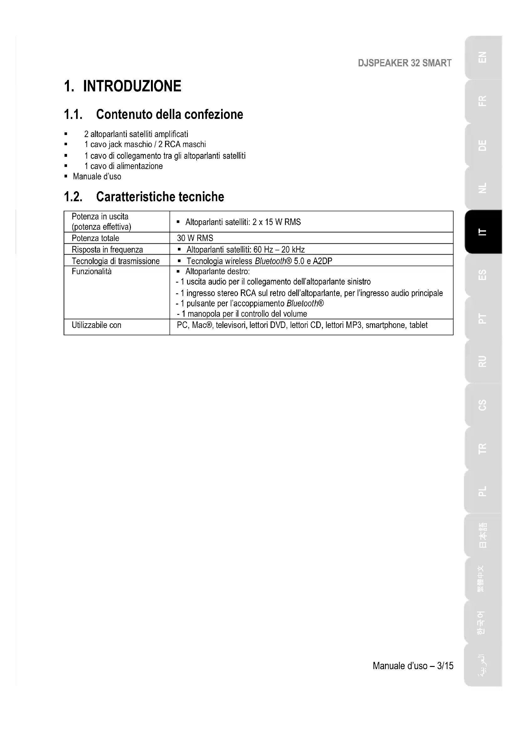 1.1. Contenuto della confezione 2 altoparlanti satelliti amplificati 1 cavo jack maschio / 2 RCA maschi 1 cavo di collegamento tra gli altoparlanti satelliti 1 cavo di alimentazione Manuale d’uso 1.2. Caratteristiche tecniche Potenza in uscita (potenza effettiva) Altoparlanti satelliti: 2 x 15 W RMS Potenza totale 30 W RMS Risposta in frequenza Altoparlanti satelliti: 60 Hz – 20 kHz Tecnologia di trasmissione Tecnologia wireless Bluetooth® 5.0 e A2DP Funzionalità