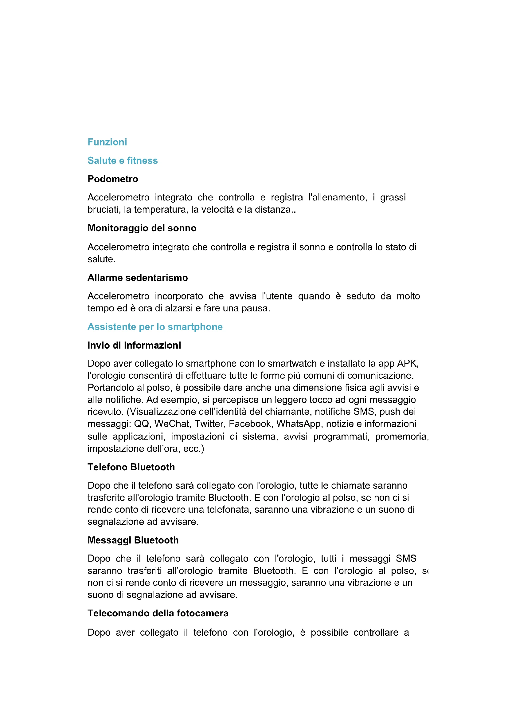 1 Smartwatch Prixton SWB17, 1 cavo micro USB, 1 manuale per l’utente Scaricare il software di sincronizzazioneTelefoni Android Scaricare l'applicazione Fondo SmartDevice da Play Store, la piattaforma per il download di applicazioni per Android, o scannerizzare il codice QR presente sulla scatola. Scaricare l'applicazione per sincronizzare l’orologio con il telefono Android. Questa applicazione viene utilizzata solo per sincronizzare l'orologio con il telefono, non utilizzerà dati mobili. Se si è già scaricato il software relativo, verificare la versione e utilizzare l'ultimo software di sincronizzazione a disposizione per garantirne il corretto funzionamento. Aggiornare il software di sincronizzazione ogni volta che esce una nuova versione. IPhone Scaricare l'applicazione Fundo SmartDevice da App Store, la piattaforma per il download di applicazioni per iOS, o scannerizzare il codice bidimensionale per iOS presente sulla scatola e installarlo. Connessione Bluetooth e funzione di sincronizzazione Dal telefono all’orologio Impostazione dell'orologio: attivare il Bluetooth, cercare i dispositivi e quando si trova il dispositivo "SWB17 Prixton" premere per abbinarlo, accettare anche sul telefono per completare la connessione. Scegliere "Si" quando si riceve una richiesta per la lista dei contatti. Inoltre, è meglio scegliere "Non ricordare la prossima volta", così non comparirà di nuovo ogni volta che si connette. Attenzione: Il software di sincronizzazione se è già installato ed è accessibile può aprire l'applicazione. Dopo 2 - 5 minuti il telefono indicherà che si è stabilita la connessione Bluetooth. Anche l'orologio notifica la connessione Bluetooth. A quel punto la sincronizzazione verrà attivata. I messaggi ricevuti sul telefono verranno sincronizzati con l'orologio. Dall'orologio al telefono Accedere al quadrante Bluetooth dell'orologio, premere su “Cerca nuovo dispositivo”. Una volta trovato il proprio telefono (ad esempio Samsung S5), selezionare “connessione”. Il resto della procedura è uguale a quella descritta nel paragrafo 4.3.1. Istruzioni Caricare completamente la batteria prima di usare l'orologio. Il tempo di carica è di circa un'ora. Utilizzare gli accessori in dotazione o quelli del proprio telefono Android. Non è possibile scollegare il Bluetooth una volta superata la distanza di portata. Dopo aver attivato la funzione anti-perdita, non è possibile utilizzarela funzione di ricerca prima di ristabilire la connessione Bluetooth. Ripristinare la connessione Bluetooth qualora si fosse persa occasionalmente. È necessario accettare la sincronizzazione dei contatti per poterne disporre sull'orologio. Durante la riproduzione di musica, alcuni nomi di canzoni non verranno visualizzati. Questo è normale ed è dovuto al funzionamento interno di Android.
