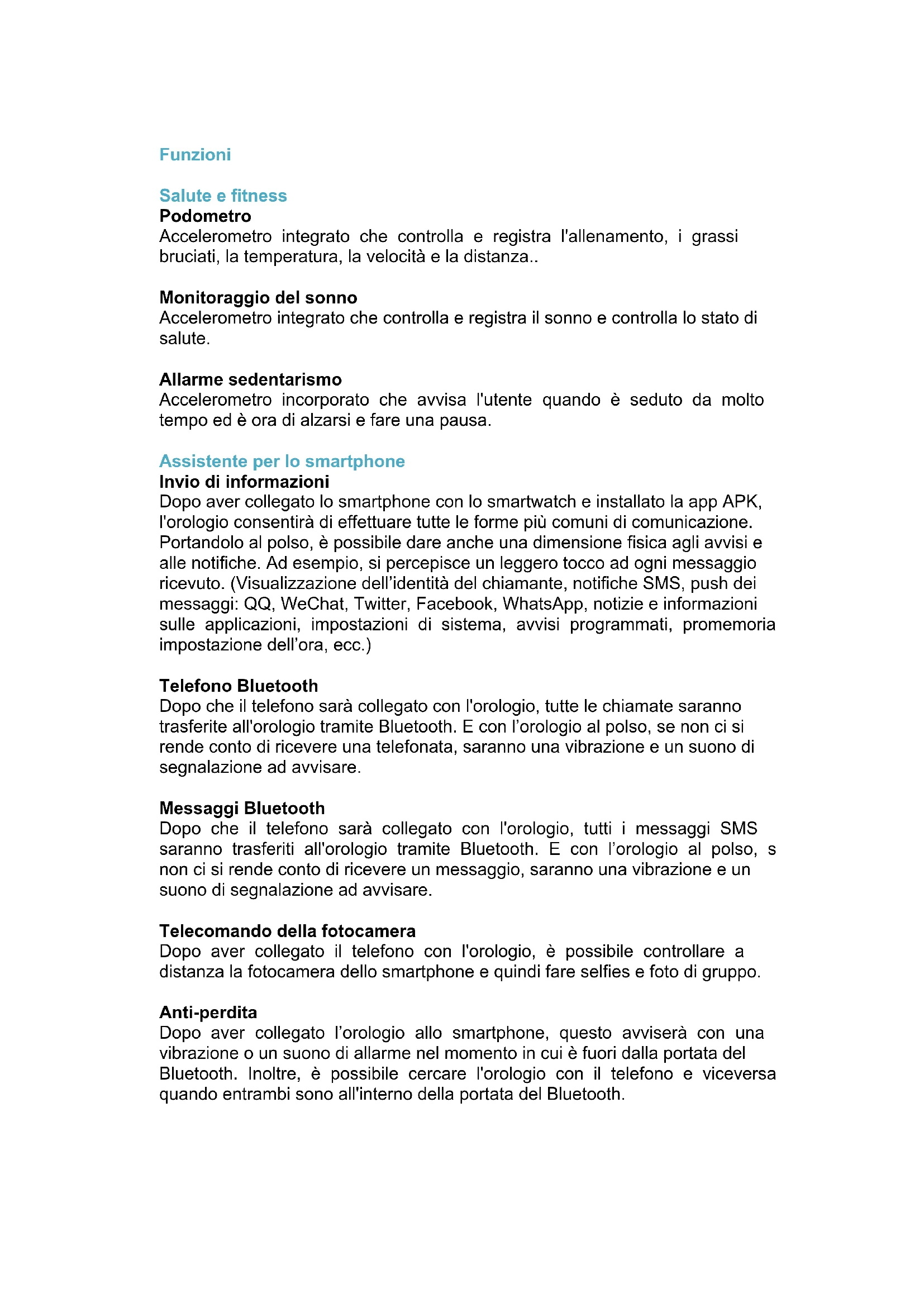 Parti !Contenuti dell’imballaggio 1 Smartwatch Prixton SW21, 1 cavo micro USB, 1 manuale per l’utente Password di sicurezza La password iniziale è 1212. Grazie a questa opzione, si impedisce ad altri di utilizzare l'orologio senza il consenso del titolare. Per garantire una totale sicurezza delle informazioni si deve cambiare la password iniziale. Scaricare il software di sincronizzazione Telefoni Android Scaricare l'applicazione Fondo SmartDevice da Play Store, la piattaforma per il download di applicazioni per Android, o scannerizzare il codice QR presente sulla scatola. Scaricare l'applicazione per sincronizzare l’orologio con il telefono Android. Questa applicazione viene utilizzata solo per sincronizzare l'orologio con il telefono, non utilizzerà dati mobili. Se si è già scaricato il software relativo, verificare la versione e utilizzare l'ultimo software di sincronizzazione a disposizione per garantirne il corretto funzionamento. Aggiornare il software di sincronizzazione ogni volta che esce una nuova versione. IPhone Scaricare l'applicazione Fundo SmartDevice da App Store, la piattaforma per il download di applicazioni per iOS, o scannerizzare il codice bidimensionale per iOS presente sulla scatola e installarlo. Connessione Bluetooth e funzione di sincronizzazione Dal telefono all’orologio Impostazione dell'orologio: attivare il Bluetooth, cercare i dispositivi e quando si trova il dispositivo "SW21 Prixton" premere per abbinarlo, accettare anche sul telefono per completare la connessione. Scegliere "Si" quando si riceve una richiesta per la lista dei contatti. Inoltre, è meglio scegliere "Non ricordare la prossima volta", così non comparirà di nuovo ogni volta che si connette. Attenzione: Il software di sincronizzazione se è già installato ed è accessibile può aprire l'applicazione. Dopo 2 - 5 minuti il telefono indicherà che si è stabilita la connessione Bluetooth. Anche l'orologio notifica la connessione Bluetooth. A quel punto la sincronizzazione verrà attivata. I messaggi ricevuti sul telefono verranno sincronizzati con l’orologio. Dall'orologio al telefono Accedere al quadrante Bluetooth dell'orologio, premere su “Cerca nuovo dispositivo”. Una volta trovato il proprio telefono (ad esempio Samsung S5), selezionare “connessione”. Il resto della procedura è uguale a quella descritta nel paragrafoIstruzioni Caricare completamente la batteria prima di usare l'orologio. Il tempo di carica è di circa un'ora. Utilizzare gli accessori in dotazione o quelli del proprio telefono Android. Non è possibile scollegare il Bluetooth una volta superata la distanza di portata. Dopo aver attivato la funzione anti-perdita, non è possibile utilizzare la funzione di ricerca prima di ristabilire la connessione Bluetooth. Ripristinare la connessione Bluetooth qualora si fosse persa occasionalmente. È necessario accettare la sincronizzazione dei contatti per poterne disporre sull'orologio. Durante la riproduzione di musica, alcuni nomi di canzoni non verranno visualizzati. Questo è normale ed è dovuto al funzionamento interno di Android.