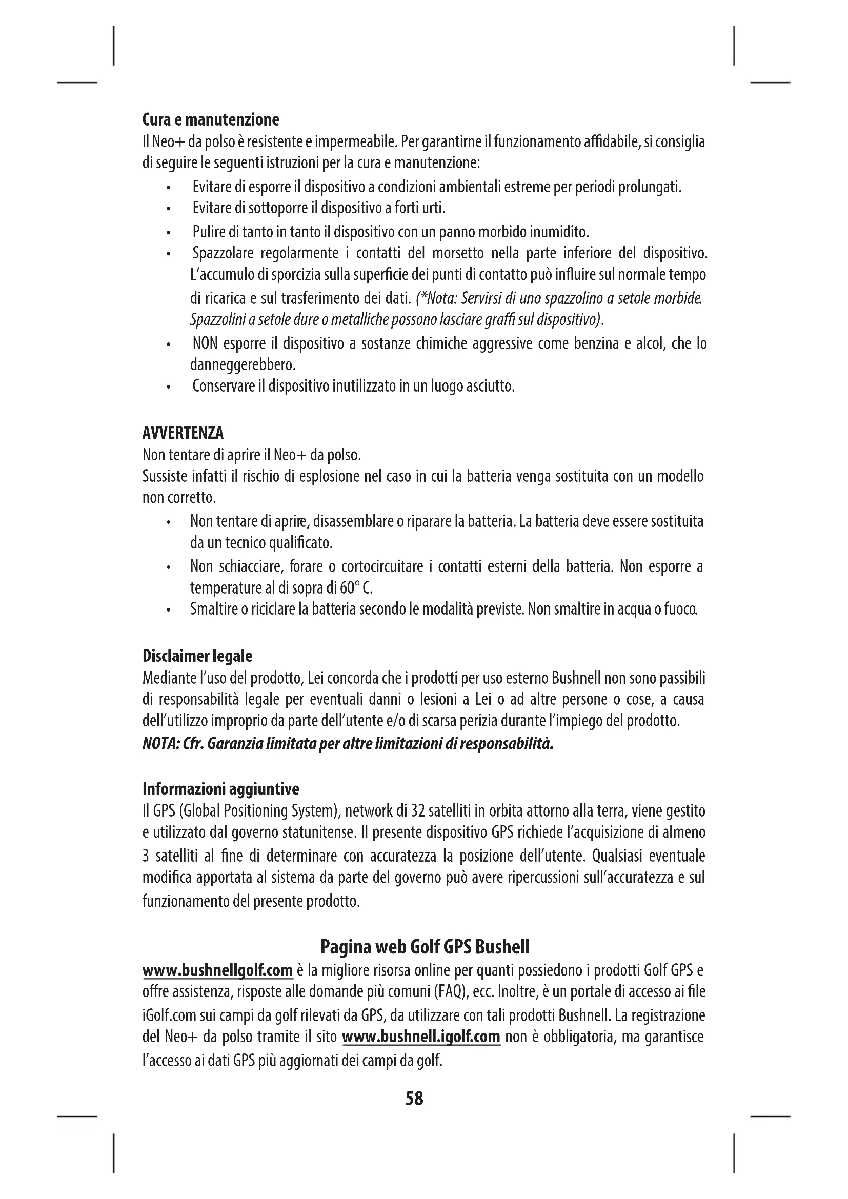 - Smaltire o riciclare la batteria secondo le modalità previste. Non smaltire in acqua o fuoco. Disclaimer legale Mediante l’uso del prodotto, Lei concorda che i prodotti per uso esterno Bushnell non sono passibili di responsabilità legale per eventuali danni o lesioni a Lei o ad altre persone o cose, a causa dell’utilizzo improprio da parte dell’utente e/o di scarsa perizia durante l’impiego del prodotto. NOTA: Cfr. Garanzia limitata per altre limitazioni di responsabilità. Informazioni aggiuntive Il GPS (Global Positioning System), network di 32 satelliti in orbita attorno alla terra, viene gestito e utilizzato dal governo statunitense. Il presente dispositivo GPS richiede l’acquisizione di almeno 3 satelliti al ne di determinare con accuratezza la posizione dell’utente. Qualsiasi eventuale modica apportata al sistema da parte del governo può avere ripercussioni sull’accuratezza e sul funzionamento del presente prodotto. Pagina web Golf GPS Bushell www.bushnellgolf.com è la migliore risorsa online per quanti possiedono i prodotti Golf GPS e ore assistenza, risposte alle domande più comuni (FAQ), ecc. Inoltre, è un portale di accesso ai le iGolf.com sui campi da golf rilevati da GPS, da utilizzare con tali prodotti Bushnell. La registrazione del Neo+ da polso tramite il sito www.bushnell.igolf.com non è obbligatoria, ma garantisce l’accesso ai dati GPS più aggiornati dei campi da golf.59 Titolo pagina Pagina # Ricarica della batteria 60 Contenuto confezione / Requisiti computer / Aggiorna- menti