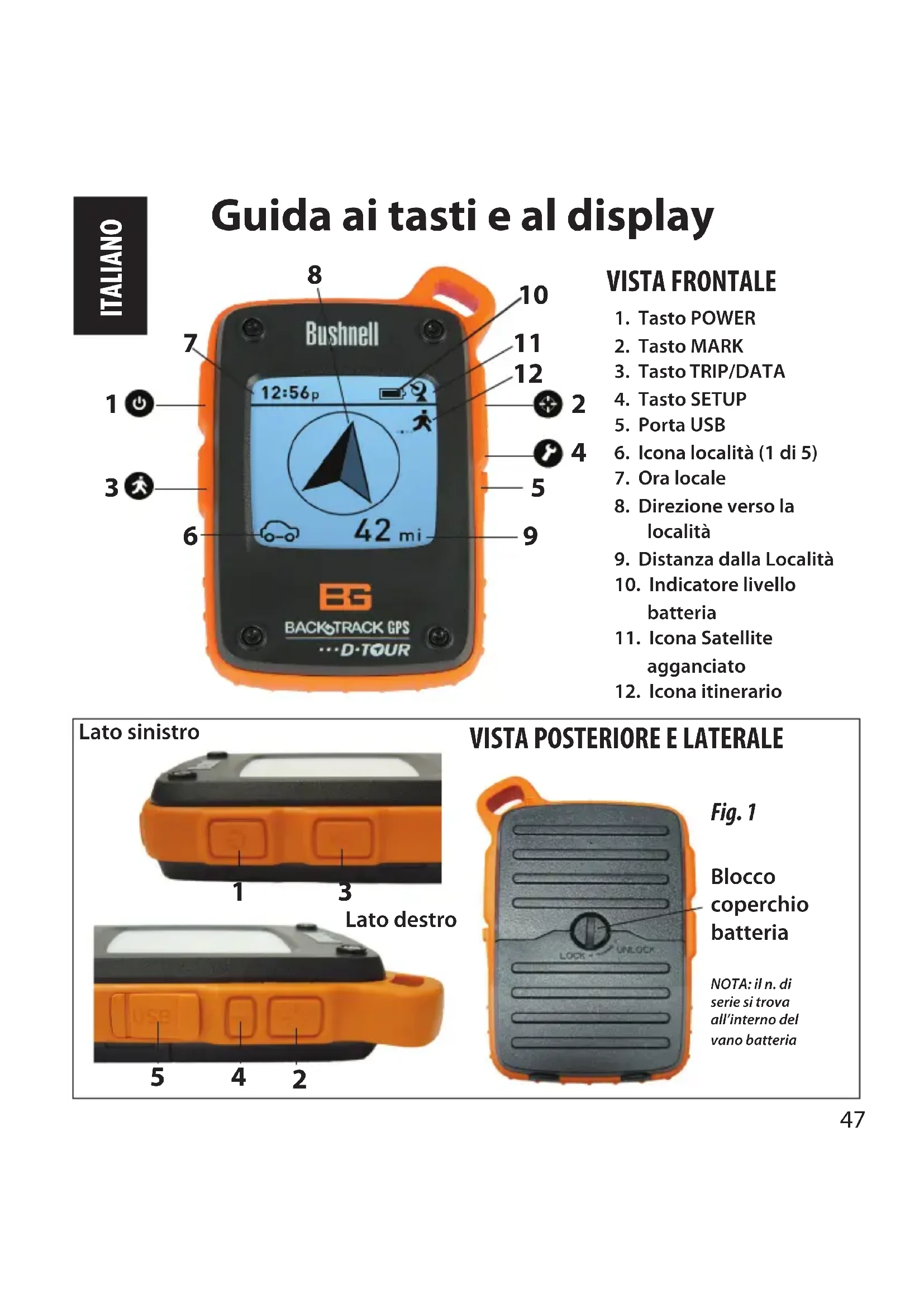 Guida ai tasti e al display ITALIANO 1. Tasto POWER2. Tasto MARK3. Tasto TRIP/DATA4. Tasto SETUP5. Porta USB6. Icona località (1 di 5)7. Ora locale8. Direzione verso la località9. Distanza dalla Località10. Indicatore livello batteria11. Icona Satellite agganciato12. Icona itinerario VISTA FRONTALE