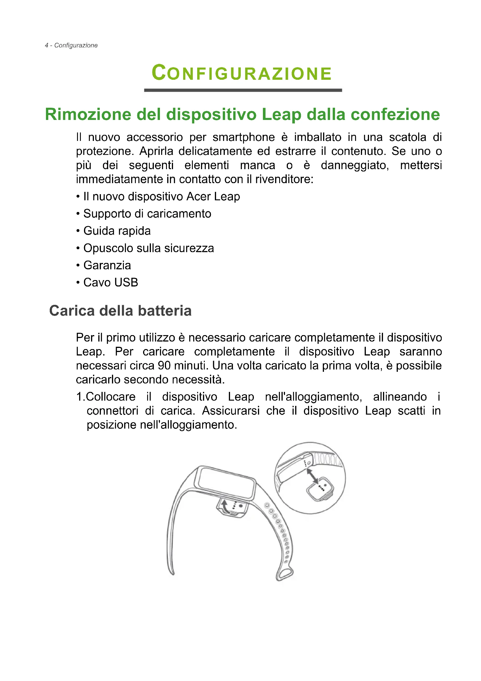 - Cavo USB Carica della batteria Per il primo utilizzo è necessario caricare completamente il dispositivo Leap. Per caricare completamente il dispositivo Leap saranno necessari circa 90 minuti. Una volta caricato la prima volta, è possibile caricarlo secondo necessità. 1.Collocare il dispositivo Leap nell'alloggiamento, allineando i connettori di carica. Assicurarsi che il dispositivo Leap scatti in posizione nell'alloggiamento.Configurazione - 5 2.Collegare il supporto al computer utilizzando il cavo USB fornito. 3.Caricare il dispositivo Leap per circa 90 minuti per completare la carica. È possibile tenere traccia dell’avanzamento della ricarica sullo schermo. Nota Toccare due volte lo schermo per vedere il livello di carica.6 - Configurazione Fissaggio del cinturino 1.Indossare il cinturino come illustrato. 2.Far passare una estremità della cinghietta attraverso l'apertura sull'altra estremità. Allineare entrambe le estremità del cinturino in modo che siano direttamente sovrapposte l'una con l'altra alla chiusura sopra i due fori che meglio si adattano al polso. 3.Premere sia la chiusura che il cinturino tra il pollice e l'indice fino a che il cinturino non sia correttamente fissato.Configurazione - 7 Il cinturino del dispositivo Leap è fissato saldamente se entrambe le linguette sulla chiusura sono pienamente inserite nel cinturino. Sostituzione della cinghietta È possibile sostituire la cinghietta se lo si desidera. Spingere attentamente il corpo del dispositivo Leap fuori dalla cinghietta e inserirlo nella nuova cinghietta, assicurandosi che sia inserito correttamente.8 - Configurazione Suggerimento per la cura e la vestibilità Tenere a mente i seguenti suggerimenti durante la cura del dispositivo Leap: