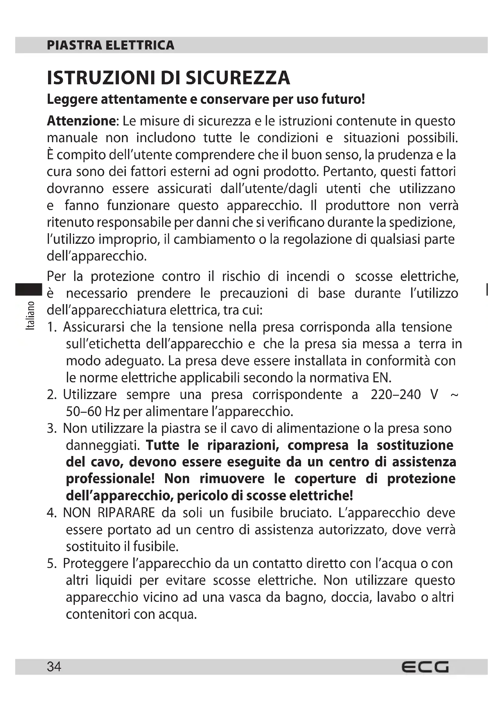 altri liquidi per evitare scosse elettriche. Non utilizzare questo apparecchio vicino ad una vasca da bagno, doccia, lavabo oaltri contenitori con acqua. PIASTRA ELETTRICA ItalianoItaliano Italiano