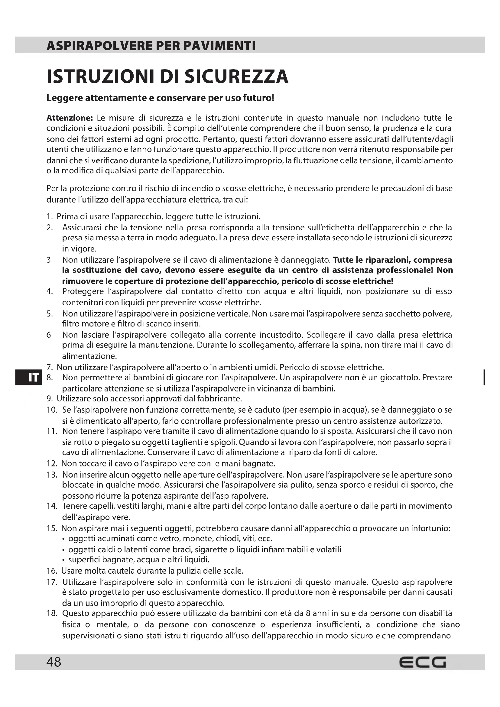 15. Non aspirare mai iseguenti oggetti, potrebbero causare danni all’apparecchio oprovocare un infortunio:
