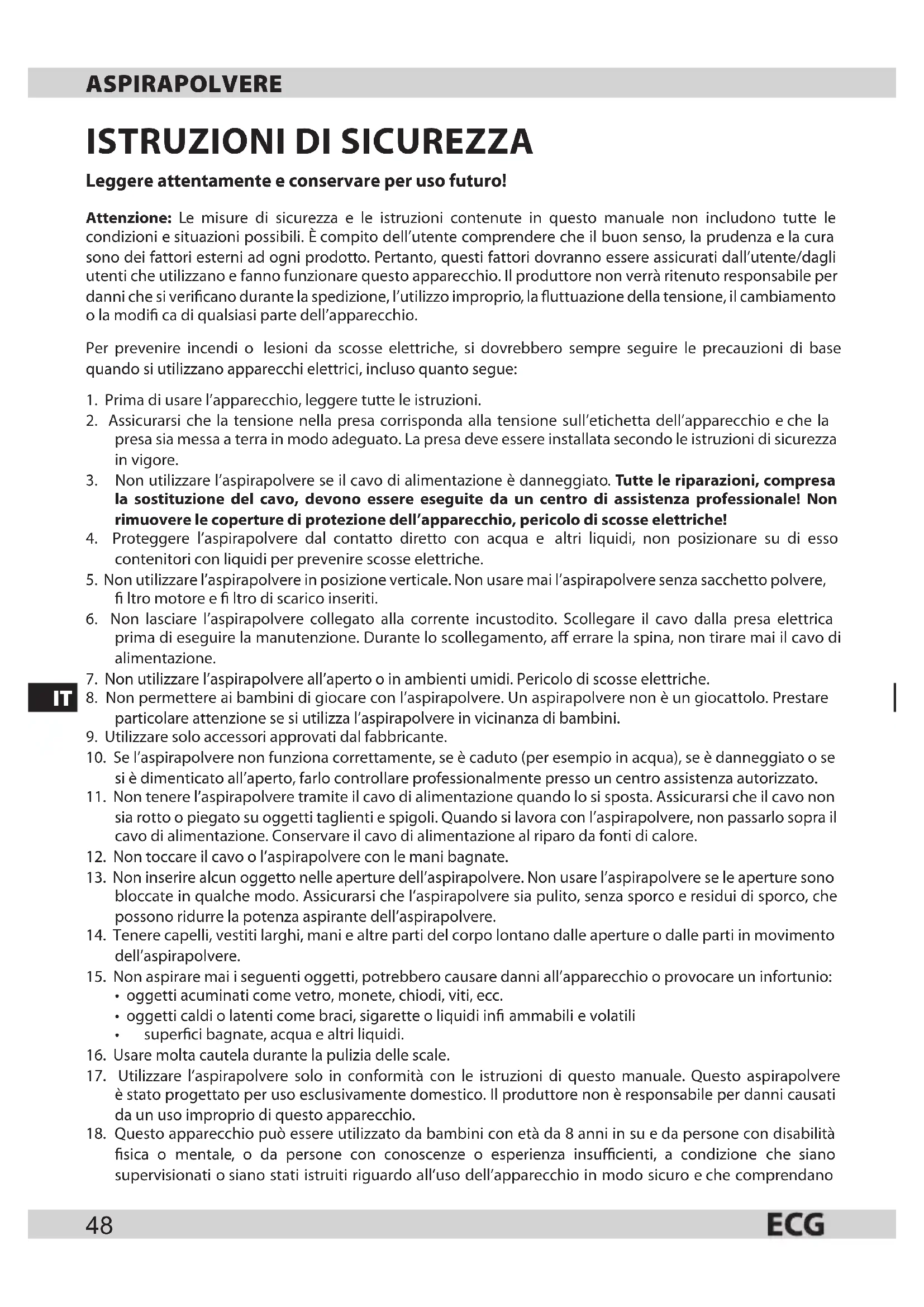 Scarica le istruzioni per il tuo Aspirapolvere in formato PDF gratuitamente! Trova il tuo manuale VP 2122 S - ECG e riprendi in mano il tuo dispositivo elettronico. In questa pagina sono pubblicati tutti i documenti necessari per l'utilizzo del tuo dispositivo. VP 2122 S del marchio ECG.