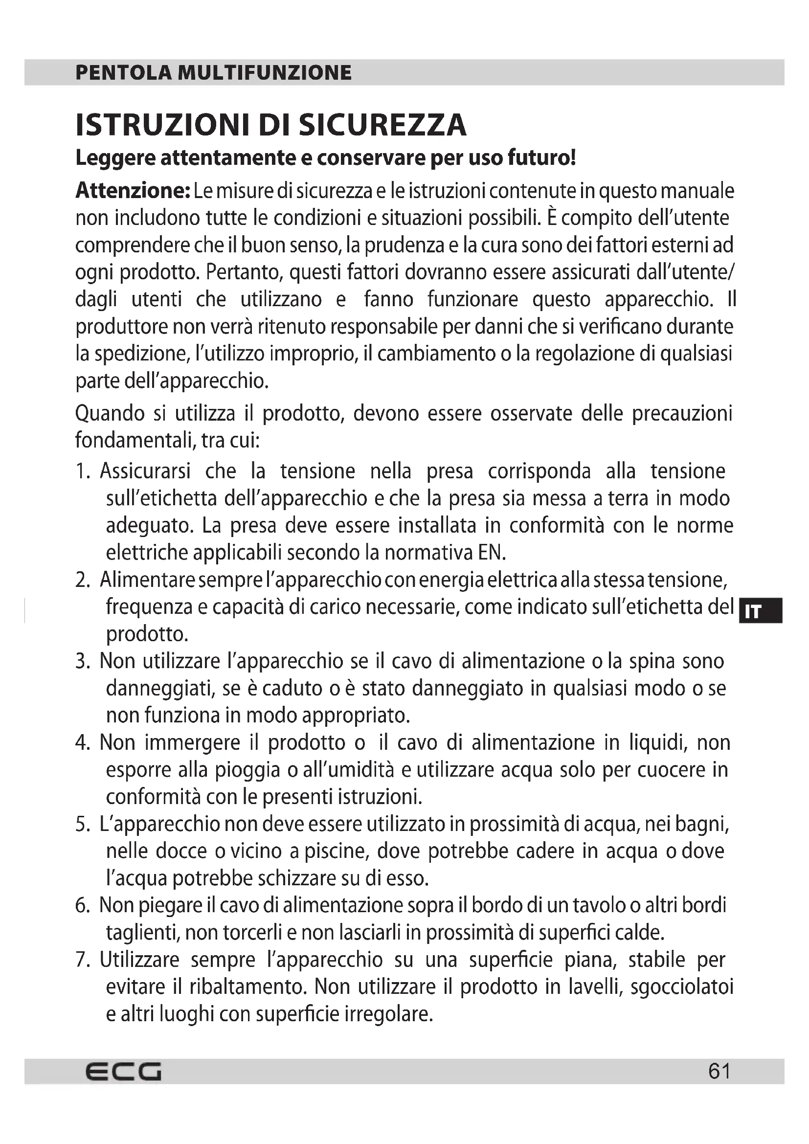 Leggere attentamente econservare per uso futuro! Attenzione: Le misure di sicurezza ele istruzioni contenute in questo manuale non includono tutte le condizioni esituazioni possibili. Ècompito dell’utente comprendere che il buon senso, la prudenza ela cura sono dei fattori esterni ad ogni prodotto. Pertanto, questi fattori dovranno essere assicurati dall’utente/ dagli utenti che utilizzano e fanno funzionare questo apparecchio. Il produttore non verrà ritenuto responsabile per danni che si vericano durante la spedizione, l’utilizzo improprio, il cambiamento ola regolazione di qualsiasi parte dell’apparecchio. Quando si utilizza il prodotto, devono essere osservate delle precauzioni fondamentali, tra cui: